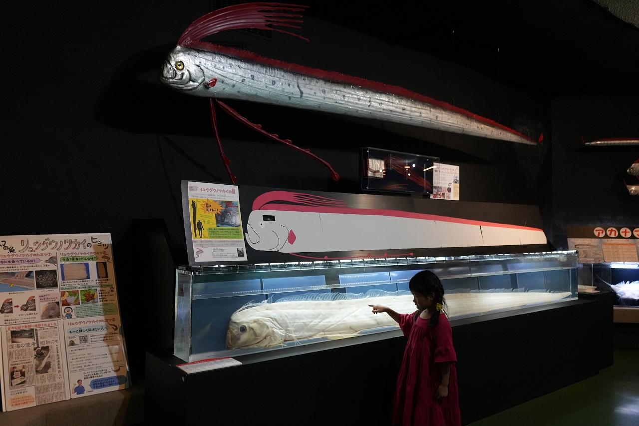 富山湾にいる美しい深海魚「リュウグウノツカイ」!ここでは、全長4.4mのはく製を見たり、一緒に記念撮影をすることも出来ます。「リュウグウノツカイ」といえば、「魚津水族館」というくらい、泳ぐ映像や脳の標本の展示などもあり、とっても充実した展示コーナーになっています。