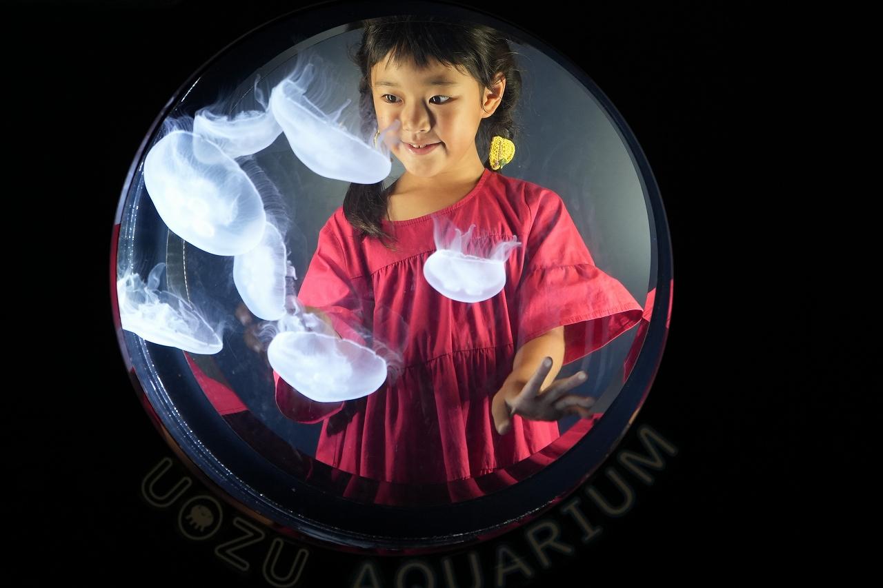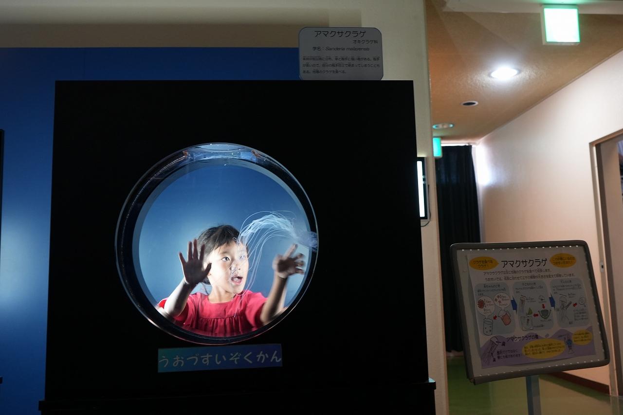 富山湾大水槽の次は、「アマモ場コーナー」!ここには、クラゲと記念撮影ができる展示があります。クラゲとともに写真を撮れるので、ぜひ、お試しを!「見て見て!どうやって泳いでいるかな?」など、子供たちが興味を引く言葉をかけると、いい表情をすることもありますよ!