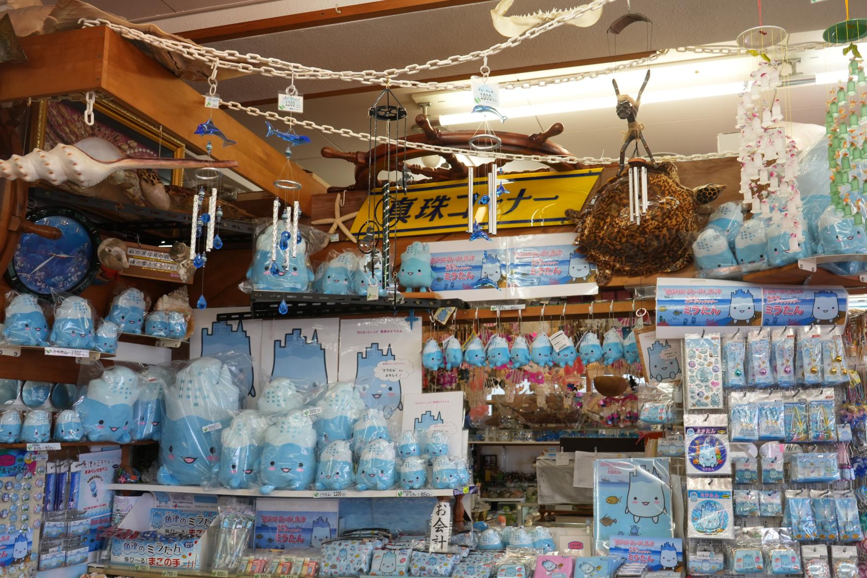 魚津市のイメージキャラクター「ミラたん」!「ミラ」とは「ミラージュ(蜃気楼)」のことで、蜃気楼の見える街「魚津」の海からやってきたらしい。これだけ豊富な種類の「ミラたんグッズ」を取り揃えているのは、ここ「真珠コーナー」が「ミラたんグッズ」を作り、販売しているからでした。魚津を愛されている店主さんだからこそ、作り出せる商品もあるとわかりました。