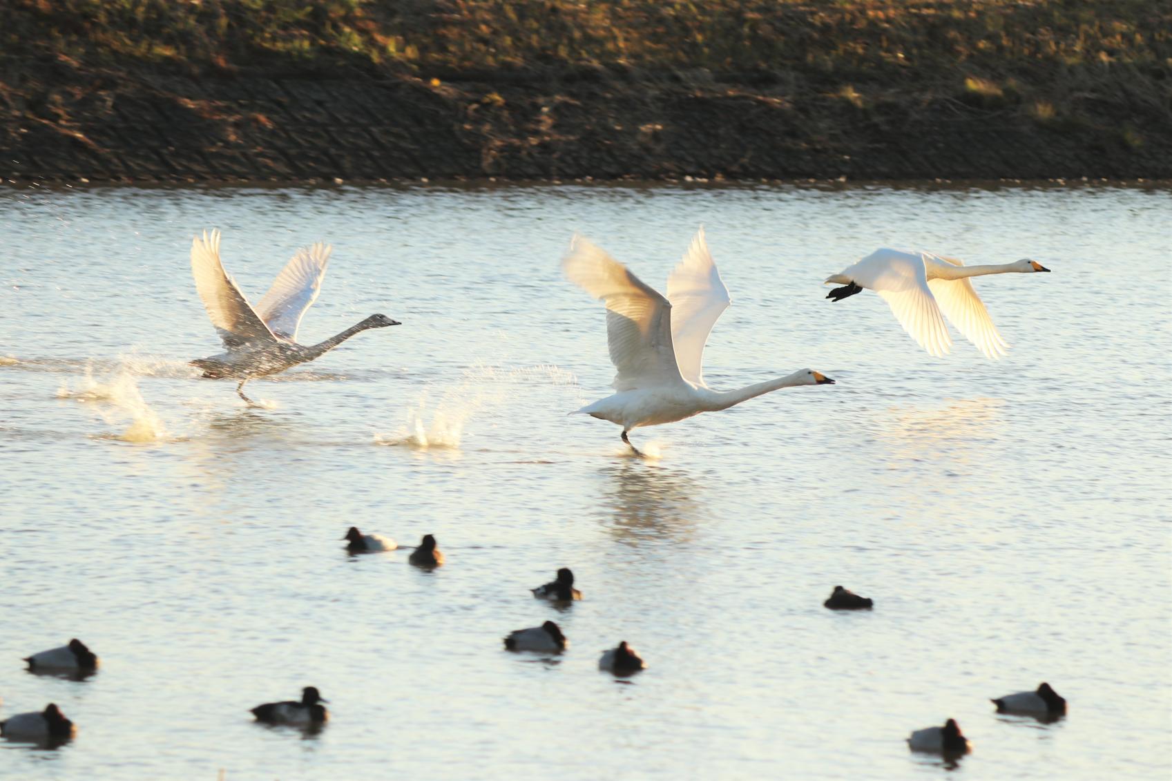 ここでは、朝7時ごろと夕方16時ごろは、管理人さんがえさをあげてます。朝は、えさを食べてから、別のえさ場(婦中町周辺)へ飛んでいきます。立山連峰から陽が昇り、飛び立っていく姿が見られます。白鳥が飛び立つとき、白く大きな羽が輝き、水しぶきがキラキラ光る光景は見ごたえがあります。