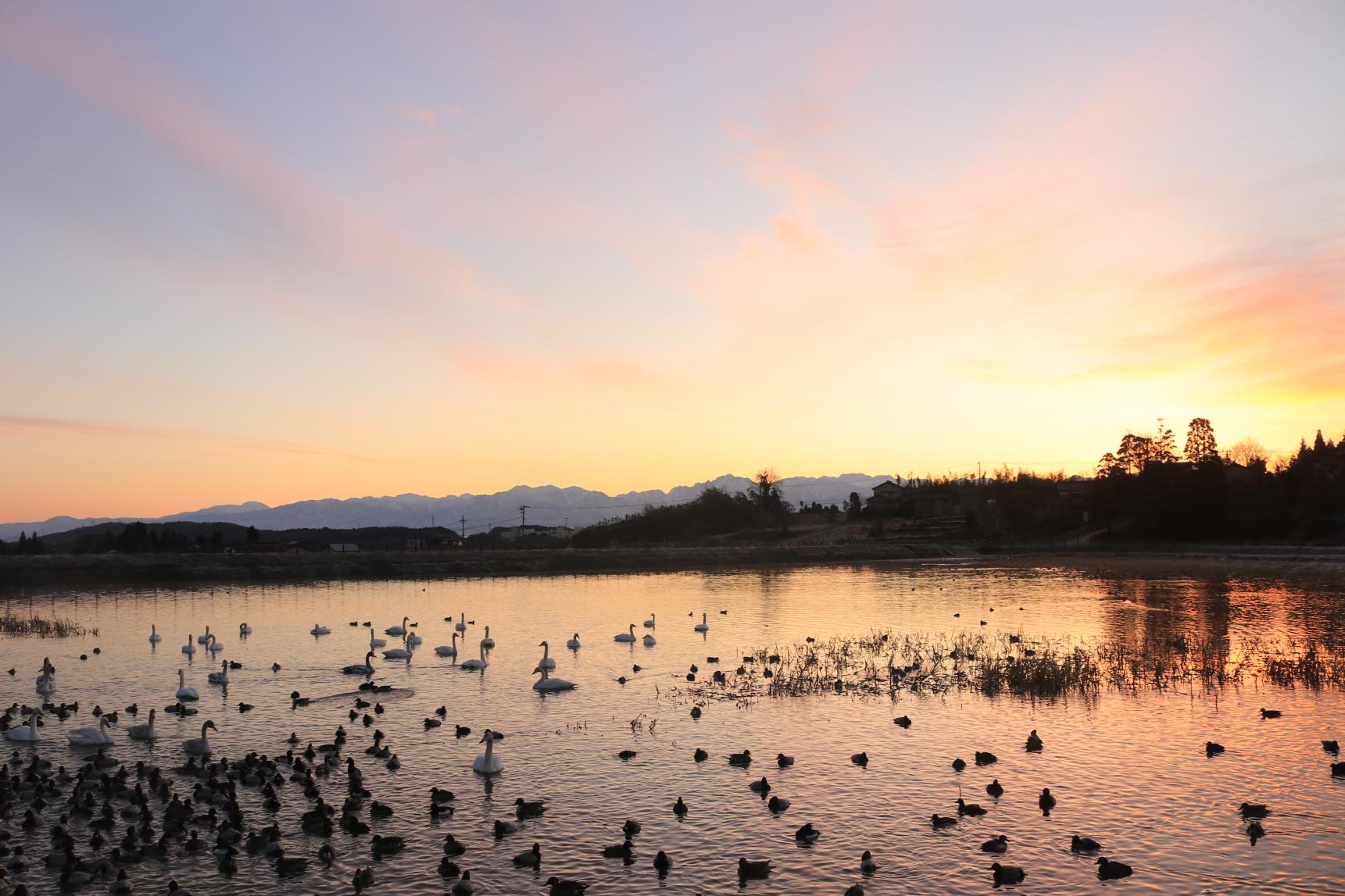赤く染まる立山連峰と白鳥の姿を一緒に見られるスポットでもあります。「田尻池」には多いときには、数百羽におよぶ白鳥が飛来します。