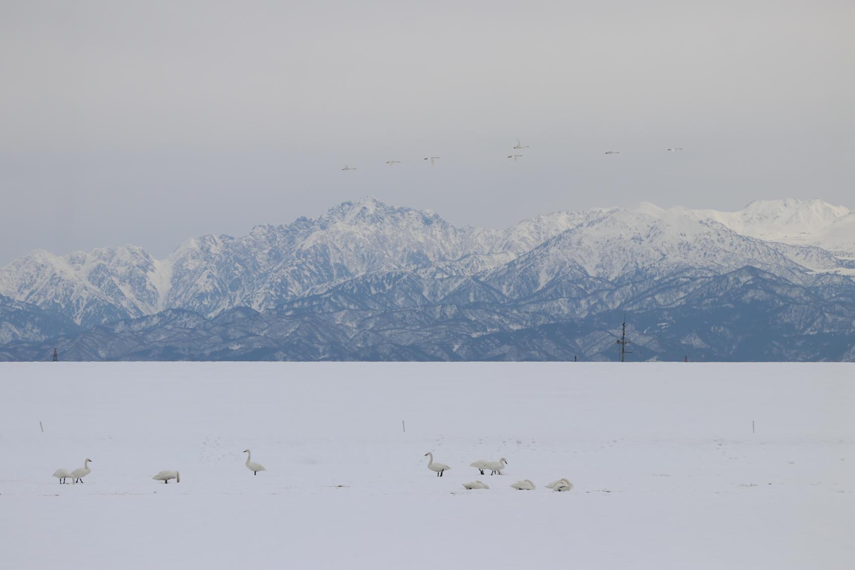 立山連峰を眺めつつ、白鳥が帰ってくるシーンも見られます!