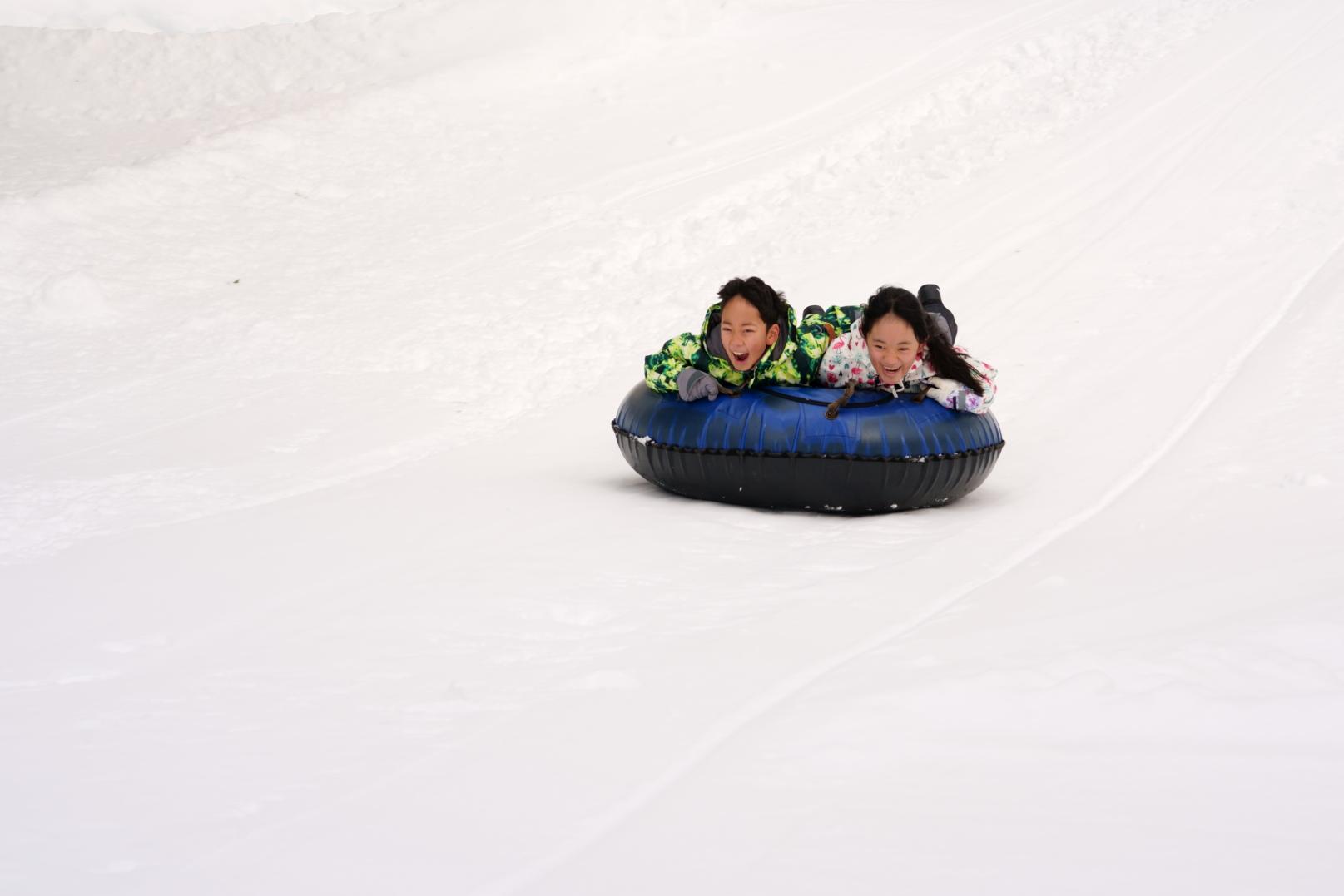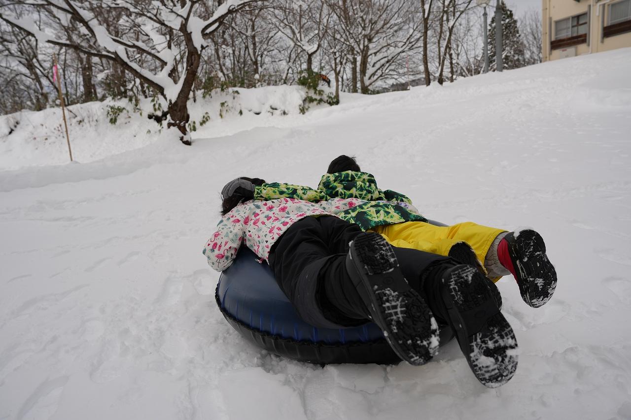 子供たちの表情に注目してください!いかに楽しいか、わかると思います。1つの「チューブそり」を使って、1人や2人で乗れます。また、座るだけではなく、寝そべることで、より地面が近く感じられ、スリリングな体験をすることが出来ました。