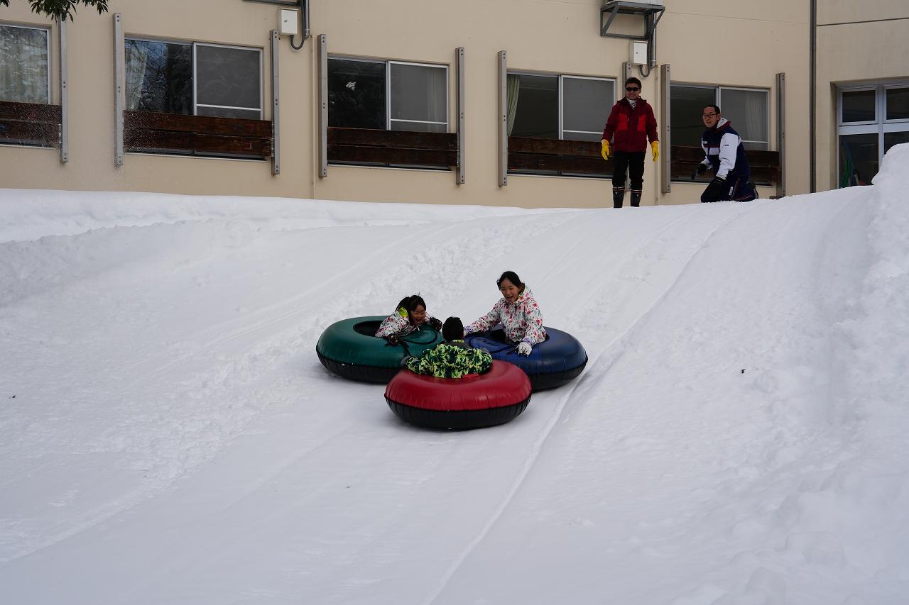 2つや3つのそりを繋いで、みんなで一斉に滑ることも出来ました。いろいろな滑り方があり、とても面白い!滑った後は、登りルートが決まっています。雪道を何度も駆け上がり、もう1回!と繰り返す子供たちでした。
