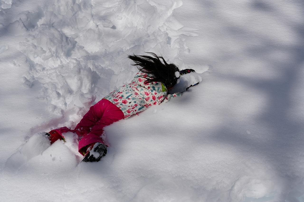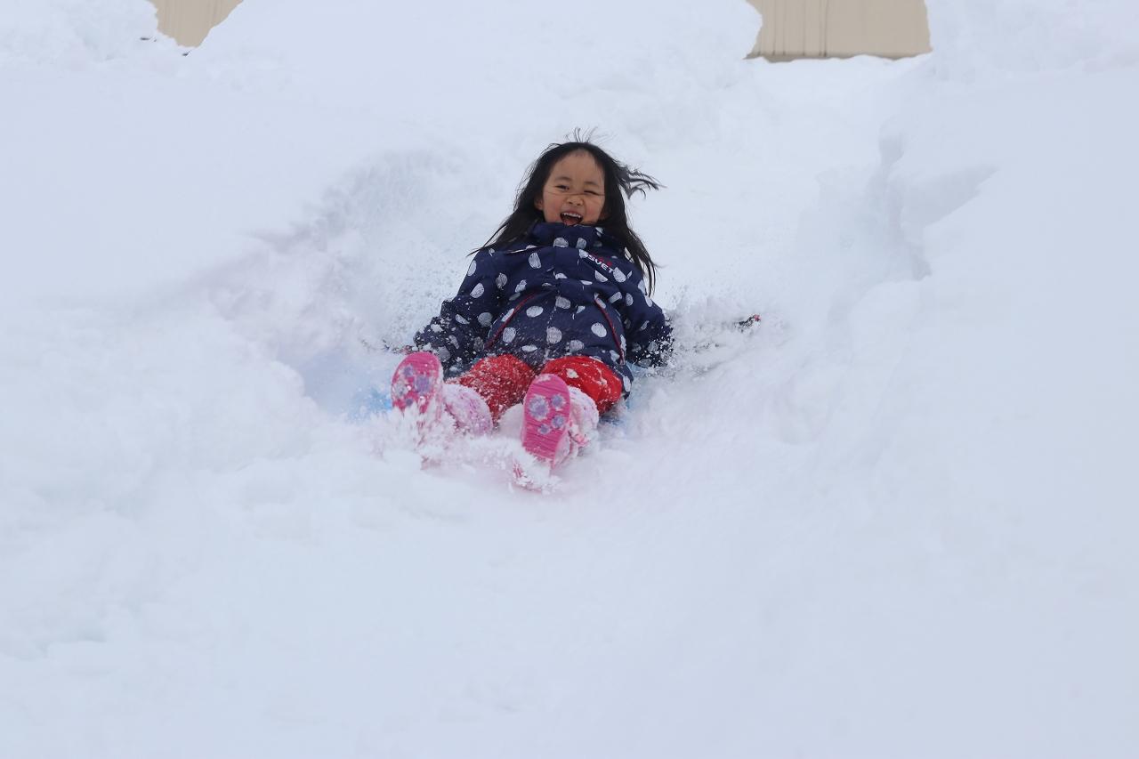 この日は、12月末。まだ積雪が少なく、ここなら出来るよ!という場所を紹介してもらいました。積もりたての雪はふかふかでとても綺麗でした。しかし、滑るためには自分たちで道を作る必要がありました。またこれが楽しい!全身を使い、雪まみれになりながら、どうすれば滑れるかを考え、何度も試しながら…。子供たちにとっても貴重な経験でした。