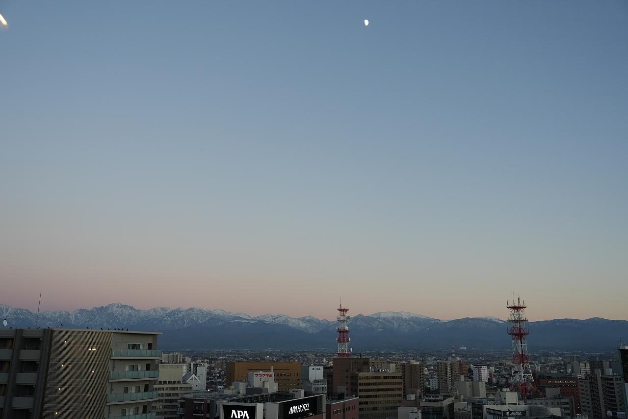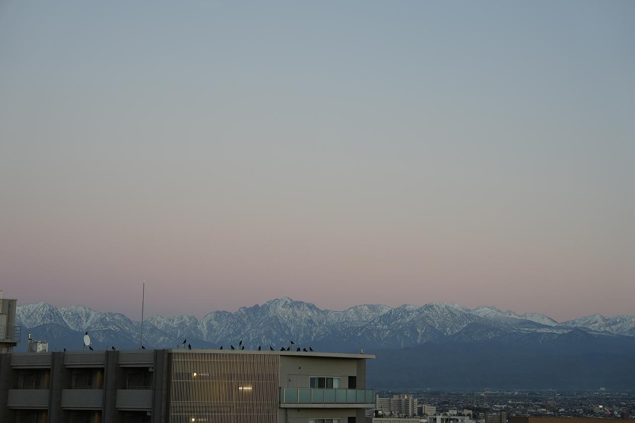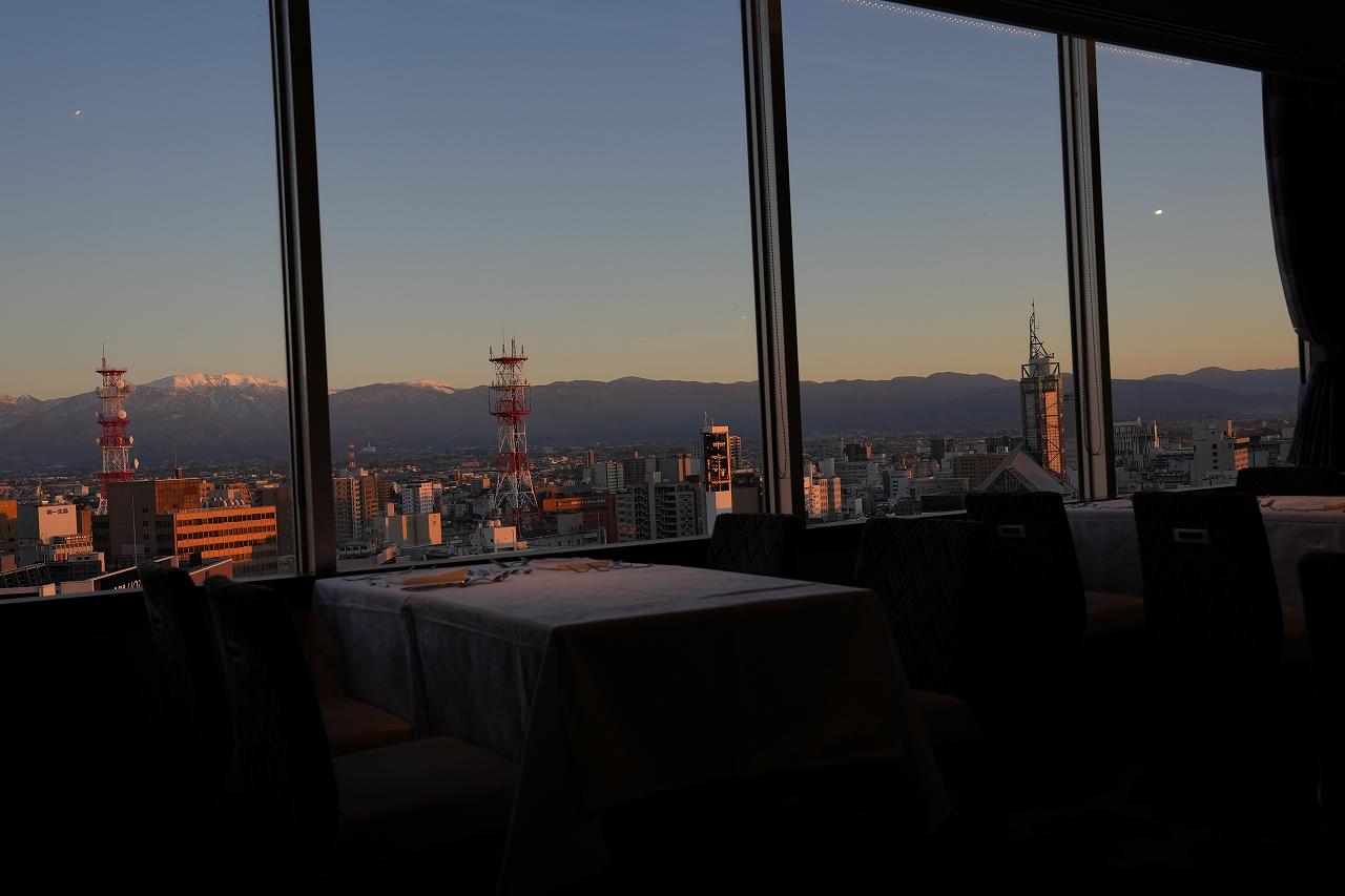 立山連峰が一望できる東側に「レストラン リコモンテ」があります。ちょうど陽が沈むころ、立山連峰が浮かび上がっていました。
