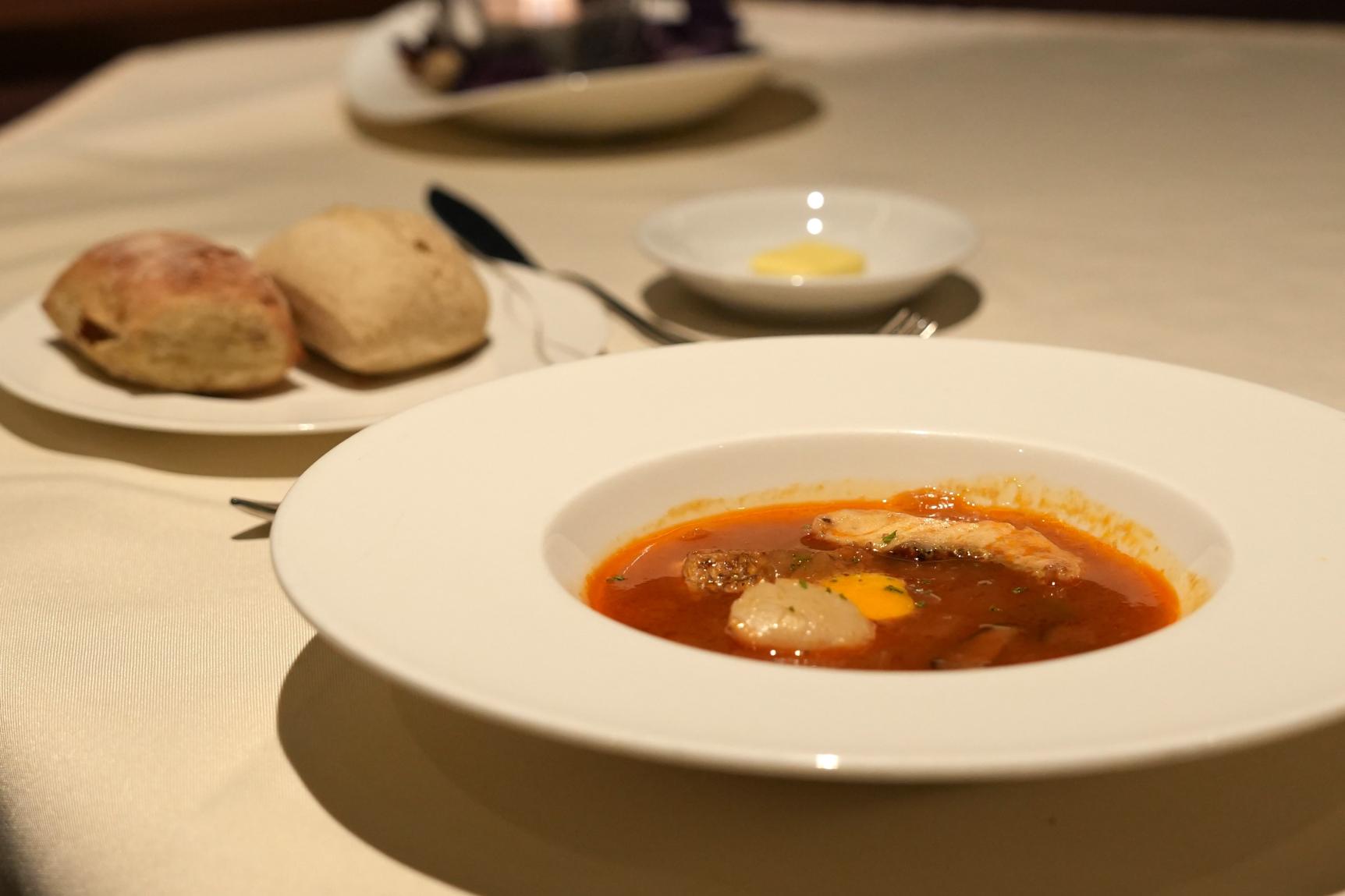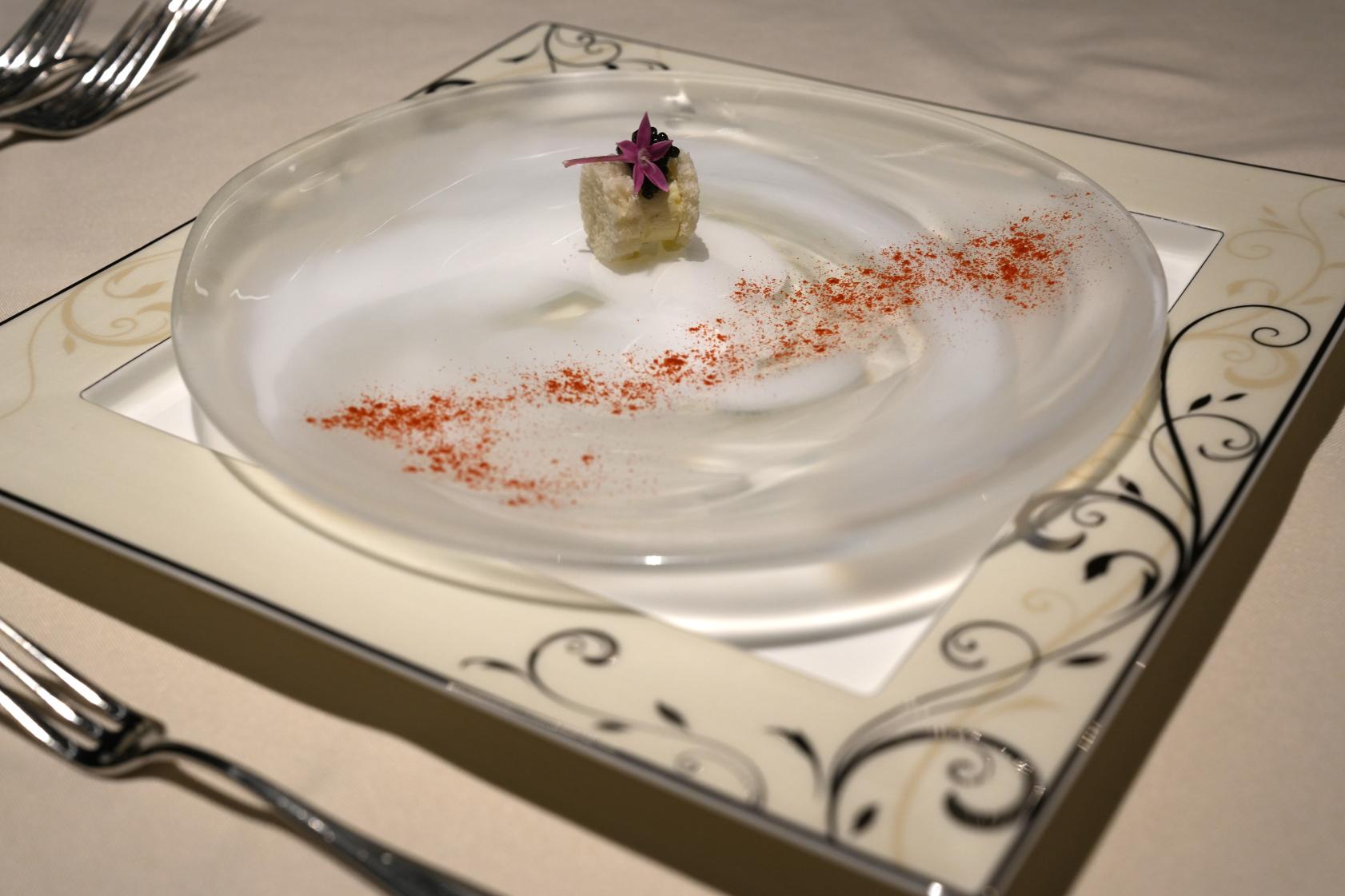 富山湾で獲れた新鮮な魚を使った「ブイヤベース」!エビや鯛が使われ、風味豊かなスープがまた美味しかったです。「ソルベ」に使われている器は、富山ガラス工房の作家さんの作品でした。器にもこだわり、見た目、香り、味すべてを楽しめることに非常に感銘を受けました。