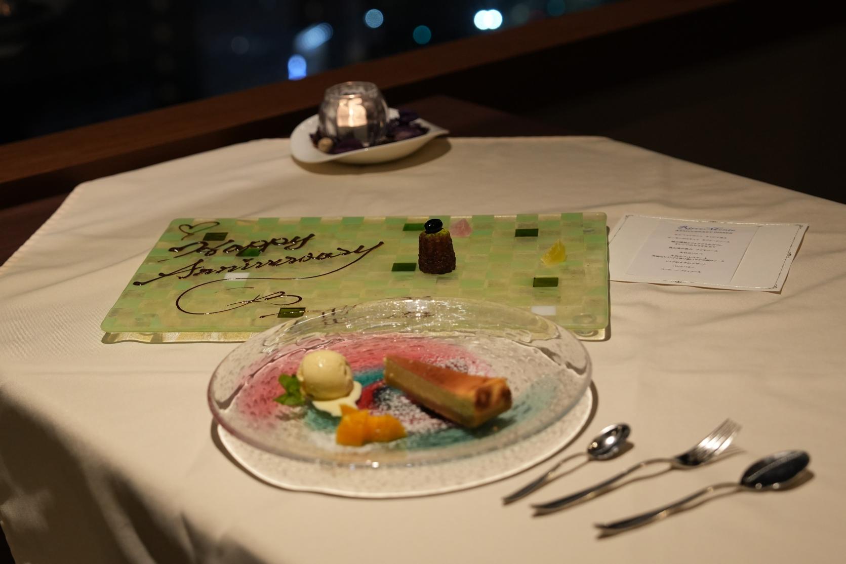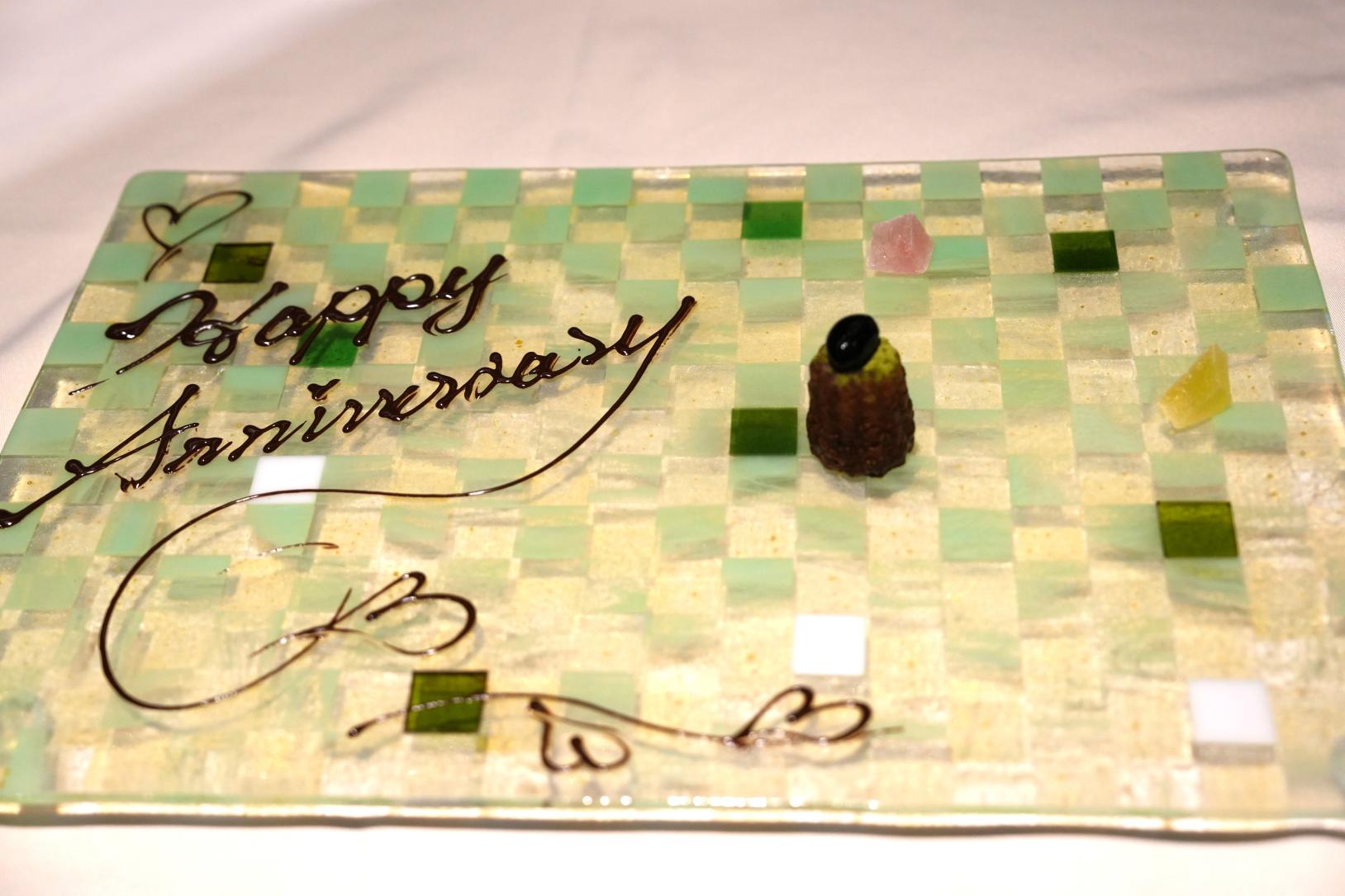 「牛肉のフィレステーキ」は、とても柔らかく、ソースの味も絶妙でした。最後までオシャレな器に、格別な料理。「アニバーサリーディナー」なので、最後にはメッセージつきのプレートが利用出来ます。予約時に、「メッセージ内容はどうされますか?」と確認されます。夫(妻)へのサプライズメッセージはいかがですか?私なら、「いつもありがとう!」や「Happy Birthday!」などサプライズで出してもらえたら想像するだけでも、幸せな気もちになれます。