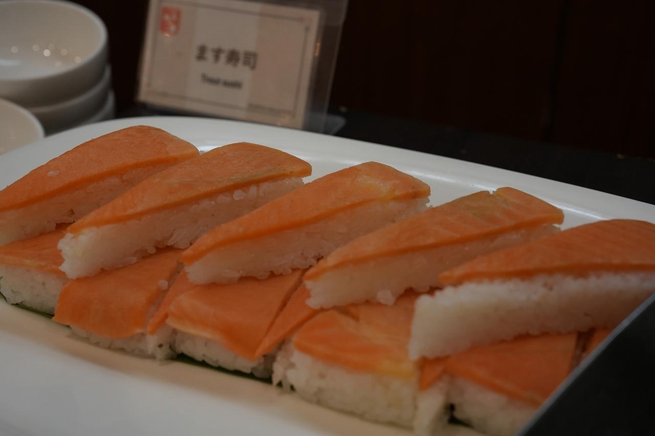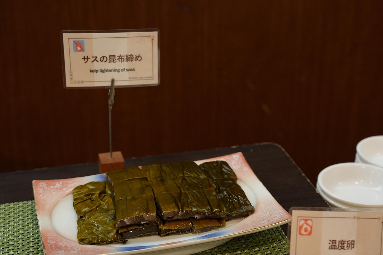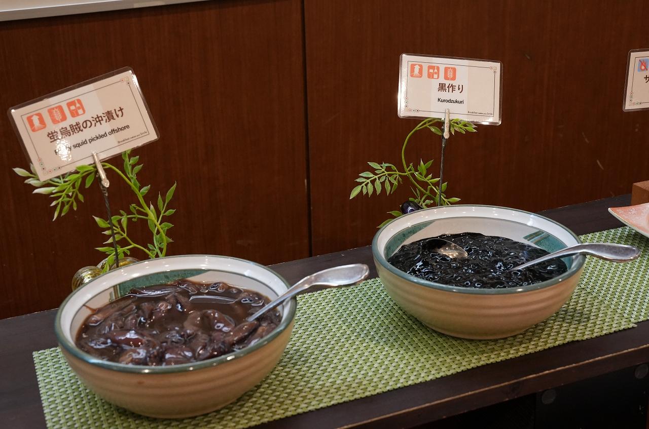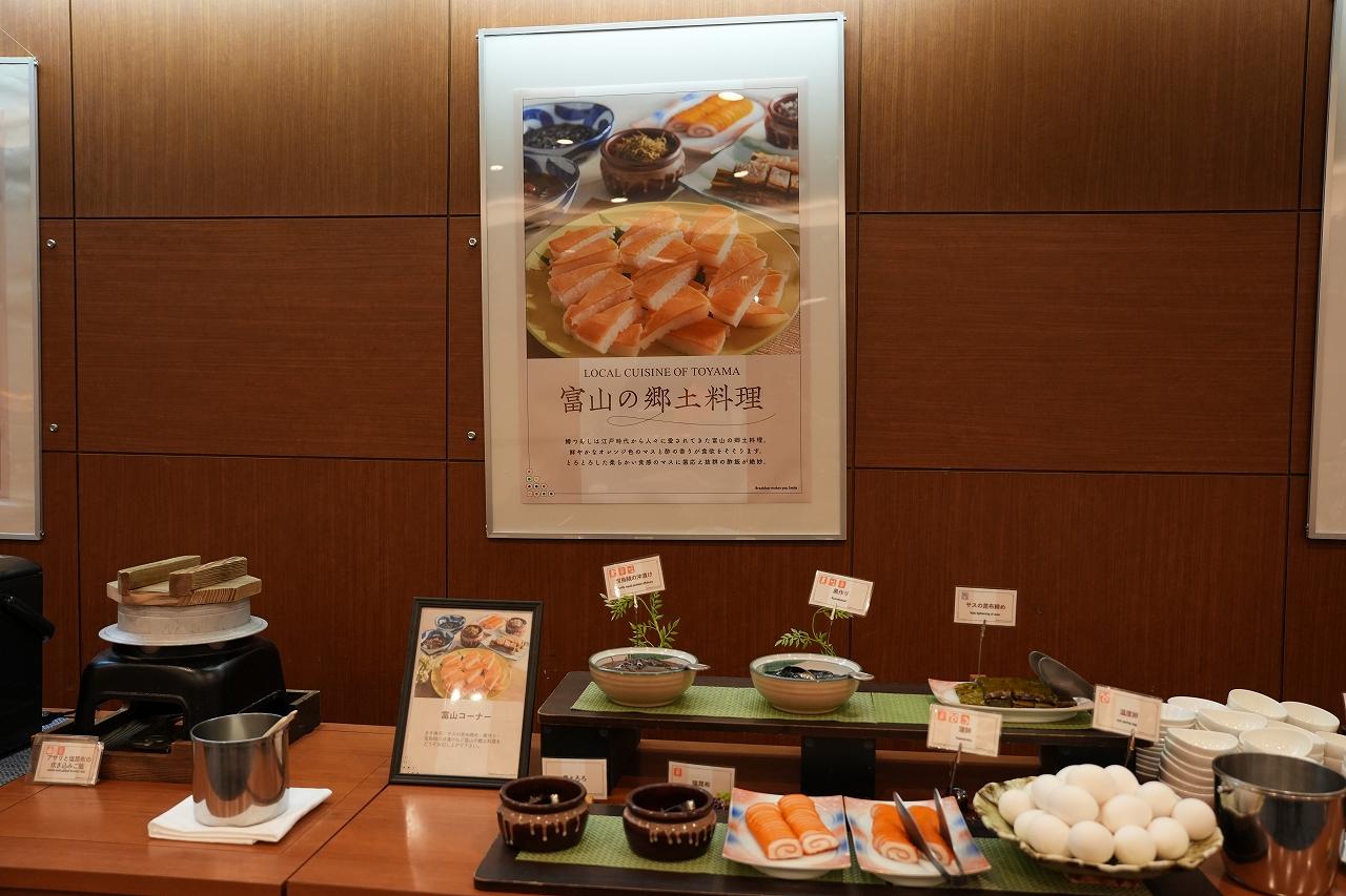 富山県産のお米、牛乳、野菜、卵と様々な食材が地元のものでした。また、「富山の郷土料理」を味わえるコーナーがあり、ます寿司、蛍烏賊(ホタルイカ)の沖漬け、黒作り、サスの昆布締めなど、富山を代表する味がずらり!少しずつ楽しむこともでき、どれも美味しい!朝から至福のひとときを過ごせます。