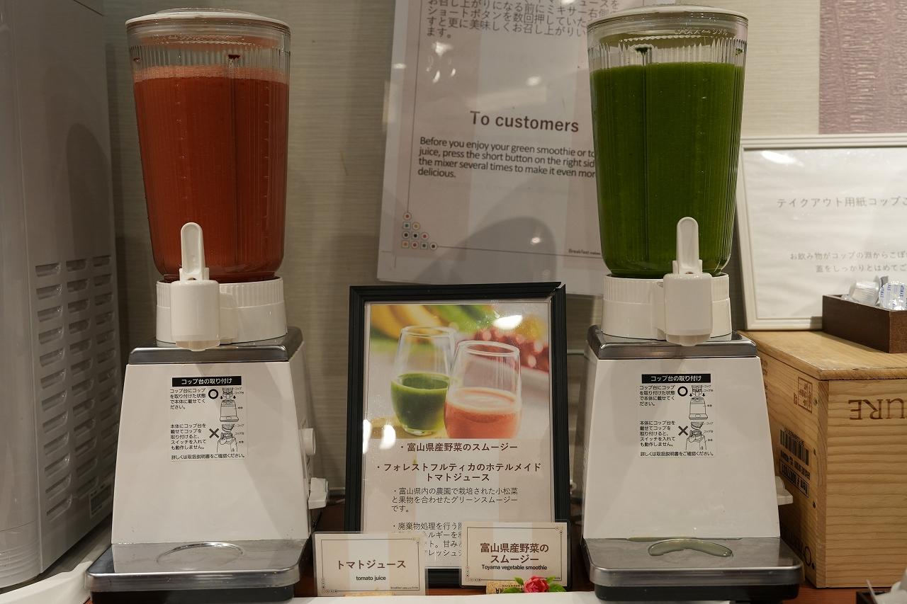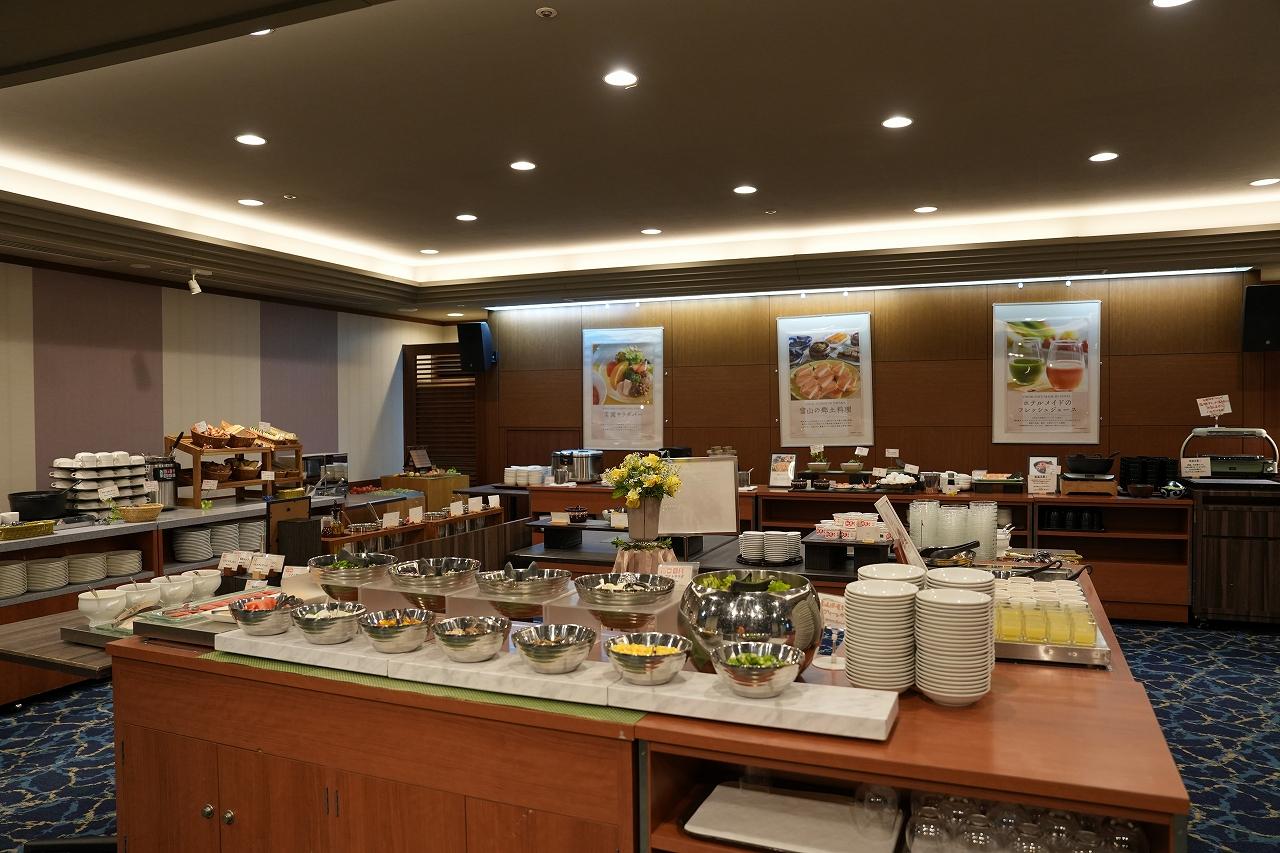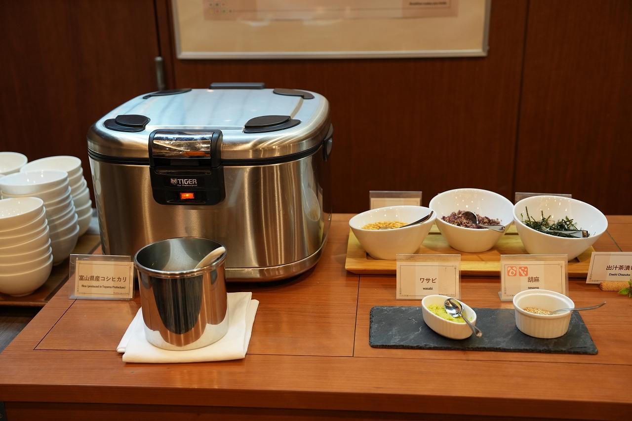 15階にある「レストラン リコモンテ」では、4種類の中から選べる料理を含む「和洋ブッフェ」が提供されています。6時半からオープンしており、お天気がいい日は立山連峰からの朝陽が昇る絶景も見られます。(泊まった日は曇っていたため、朝陽は見られませんでした。)また、同階にある「ファンクションルーム」では、「和朝食 富山御膳」もあり、好きな食事を選ぶことができます。