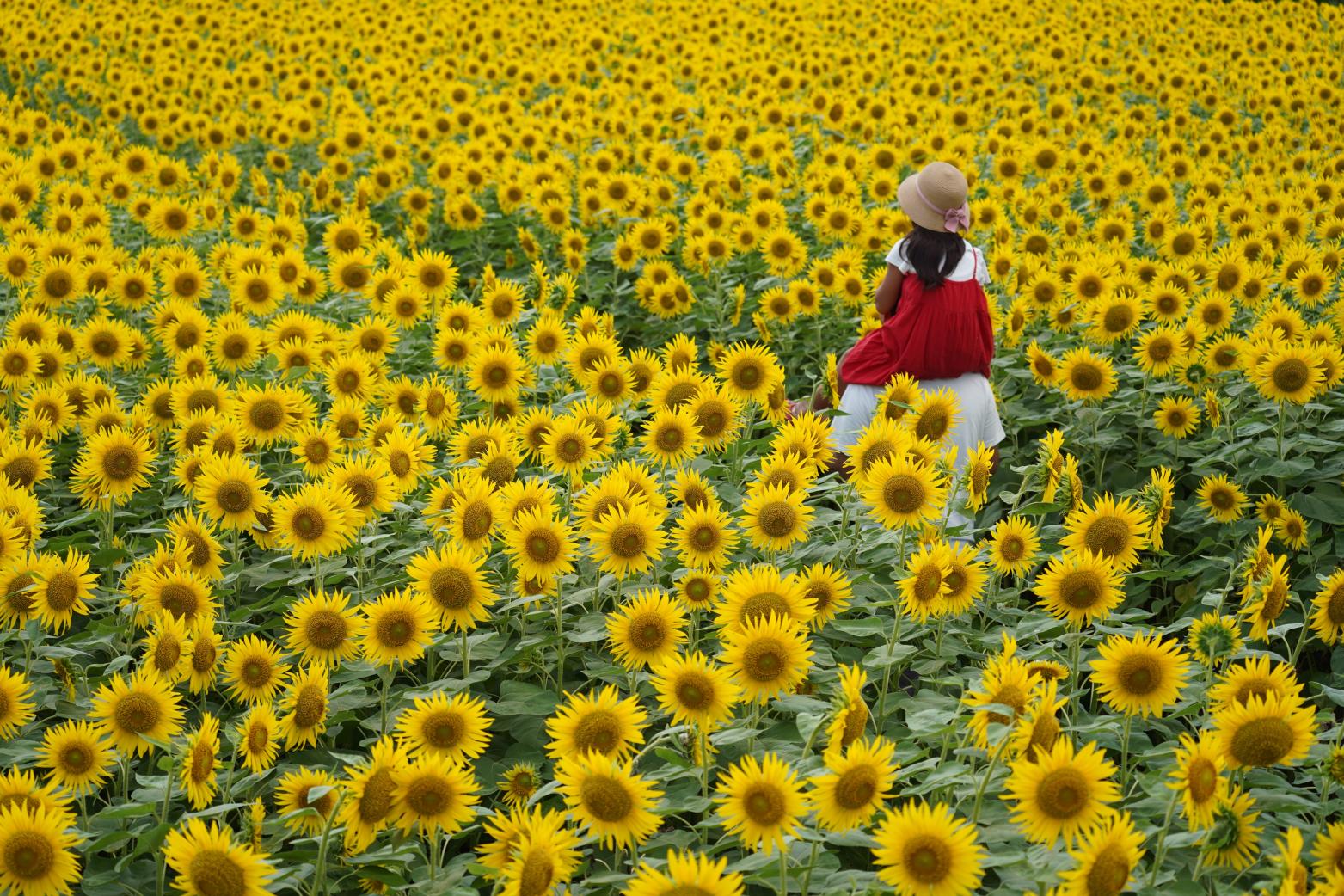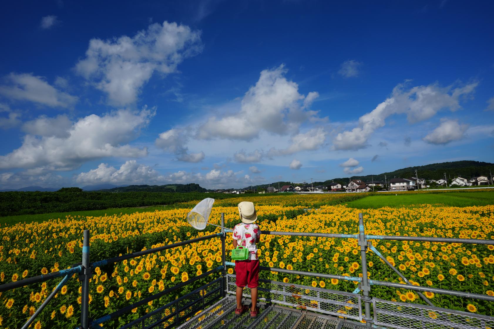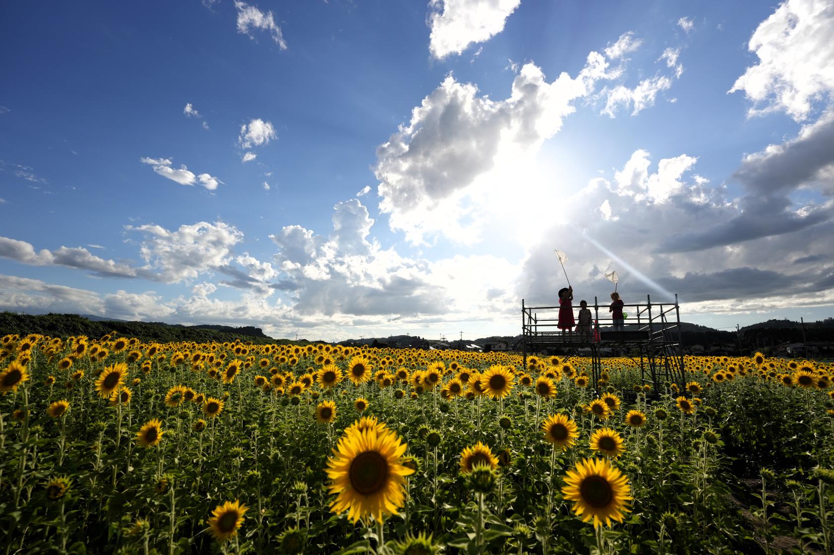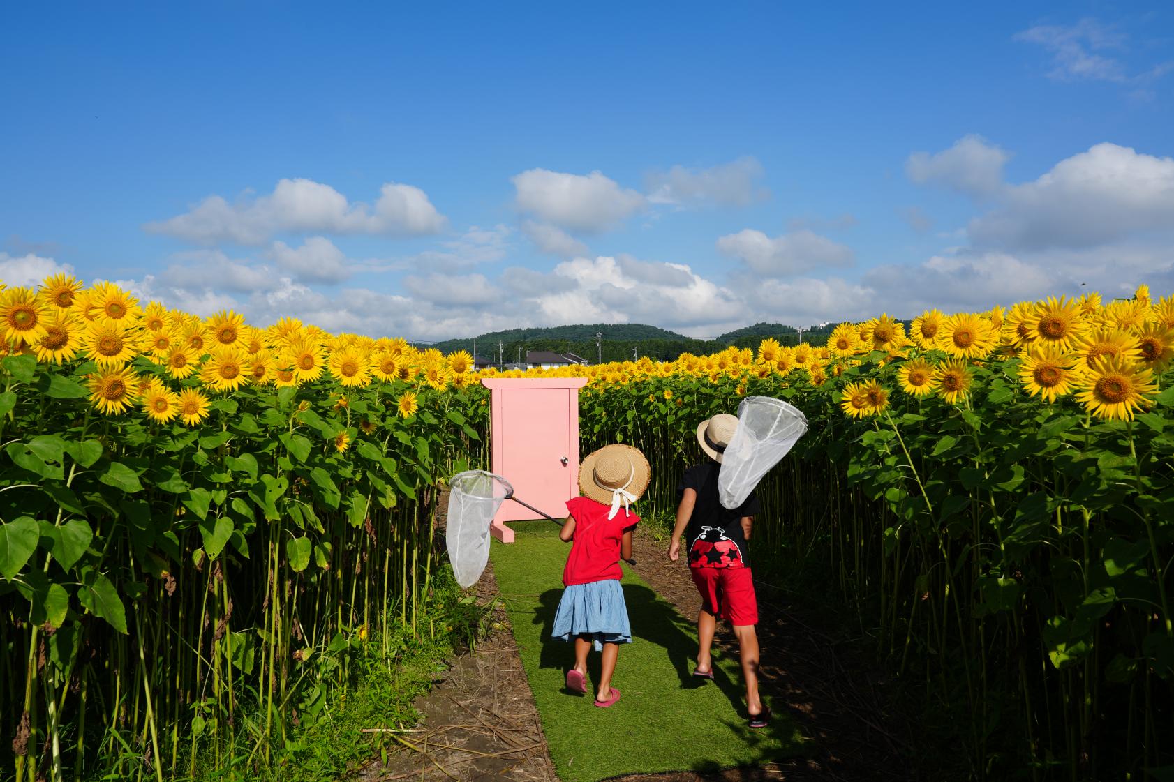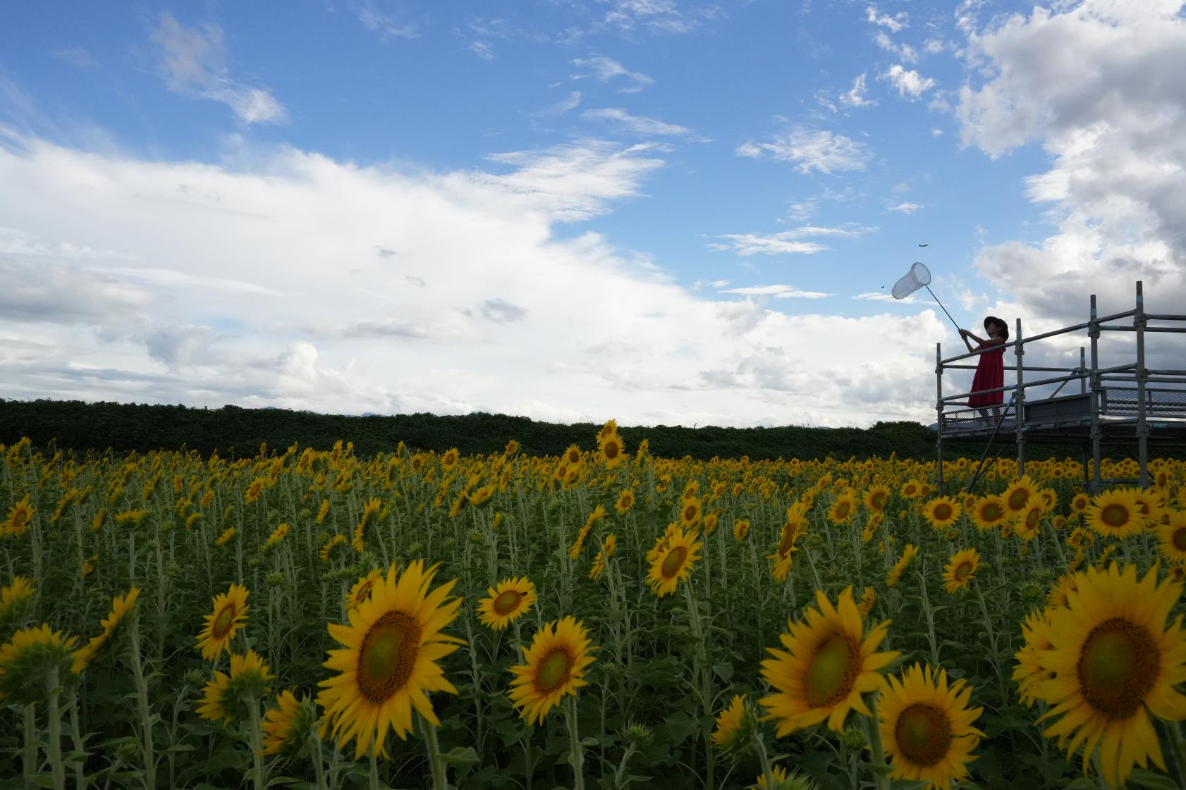 こちらは、別の日の夕暮れ時に訪れました。雨上がり、太陽が顔を出し、ヒマワリ畑にやさしい光が差し込み始めました。逆光の中、展望台にいる子どもたちと畑を一緒に撮るのもとても印象的でした。トンボやチョウが舞い、虫取りに夢中になる子どもたちの姿もあり、夏休みの思い出ができたひとときでした。