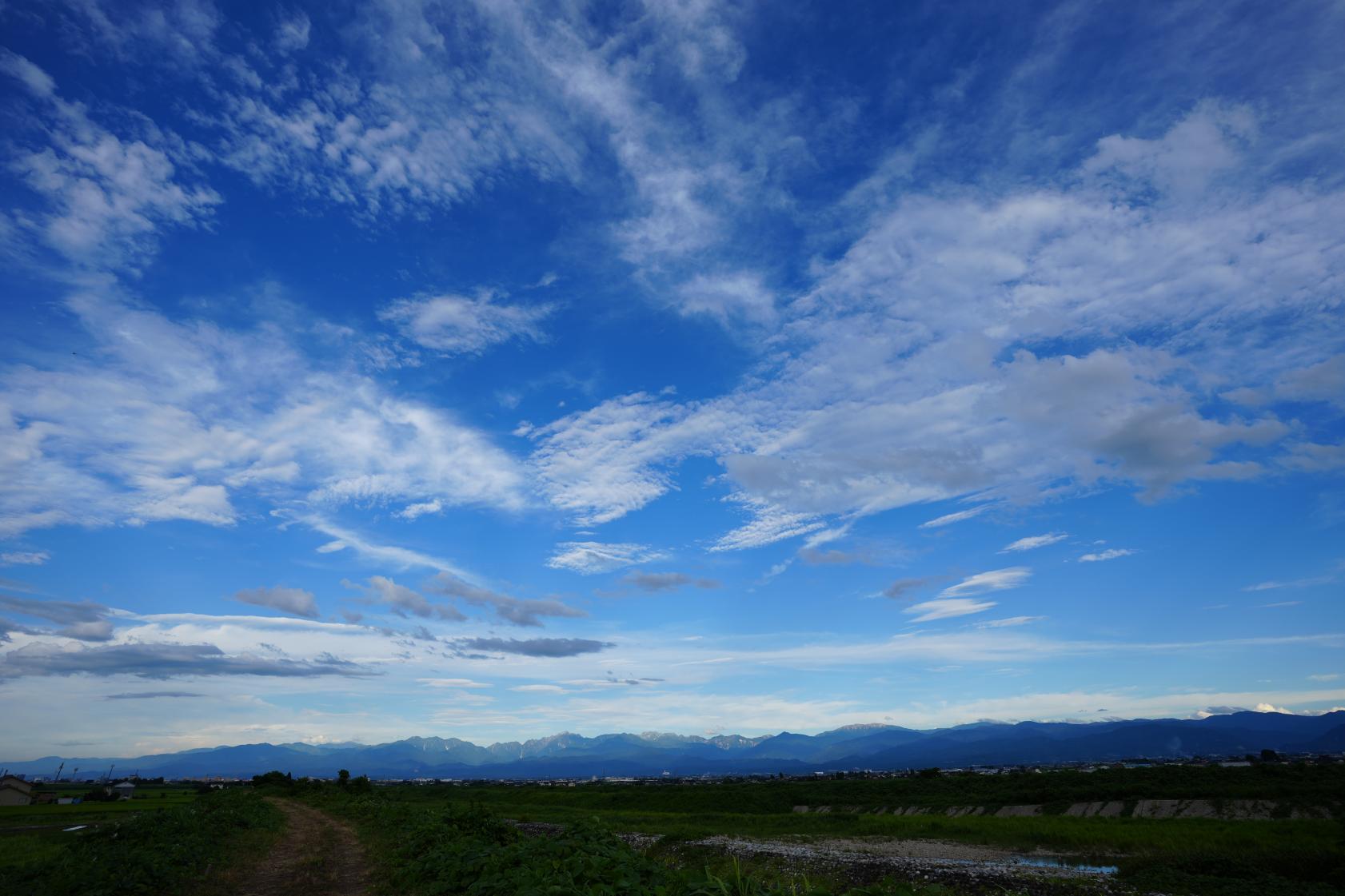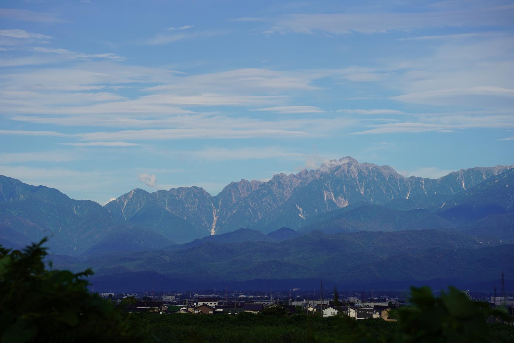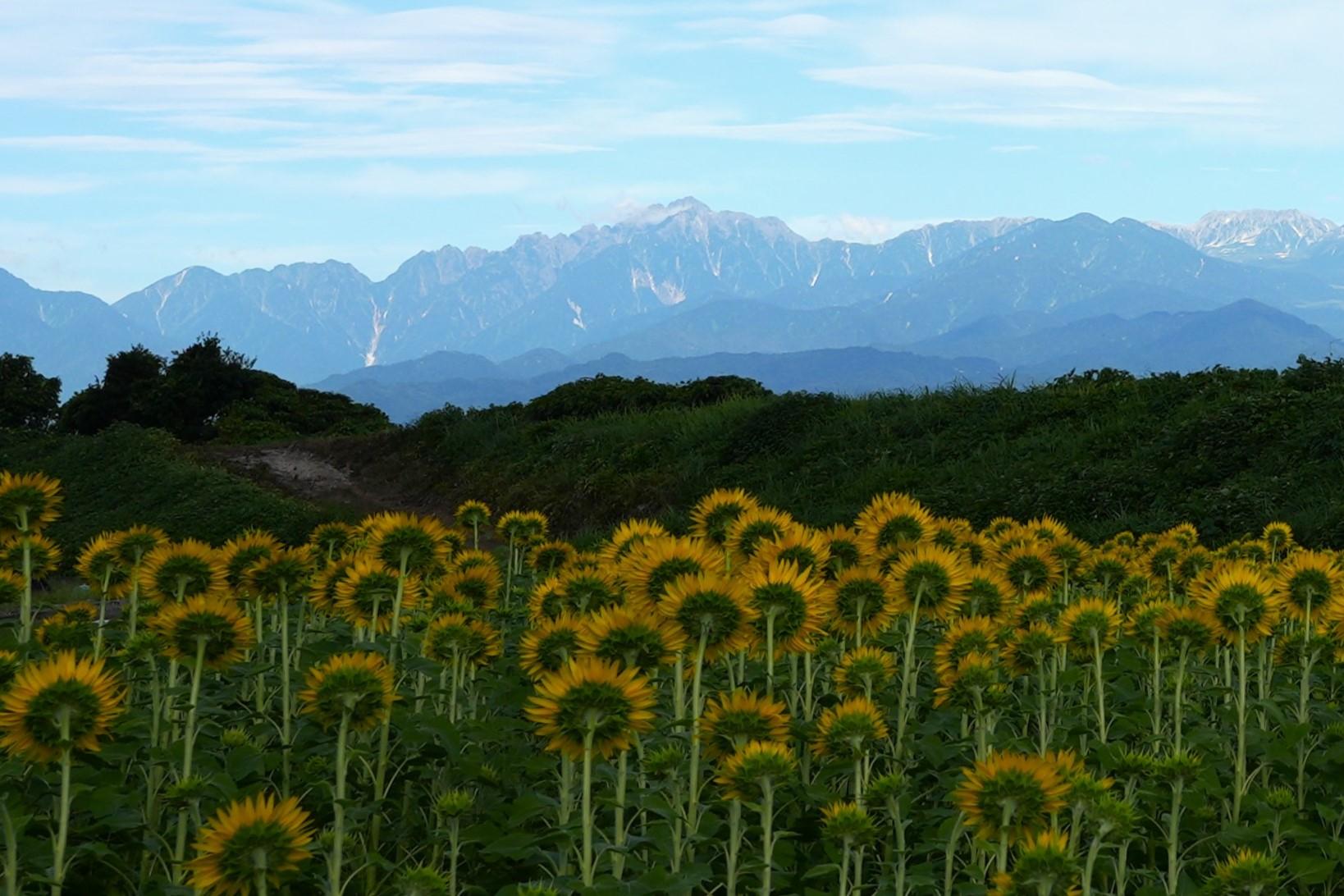 夏の立山連峰とヒマワリ畑のコラボレーションです。ヒマワリ畑の隣には山田川が流れており、河川敷に行くことができます。ここから見る景色も絶景です。
