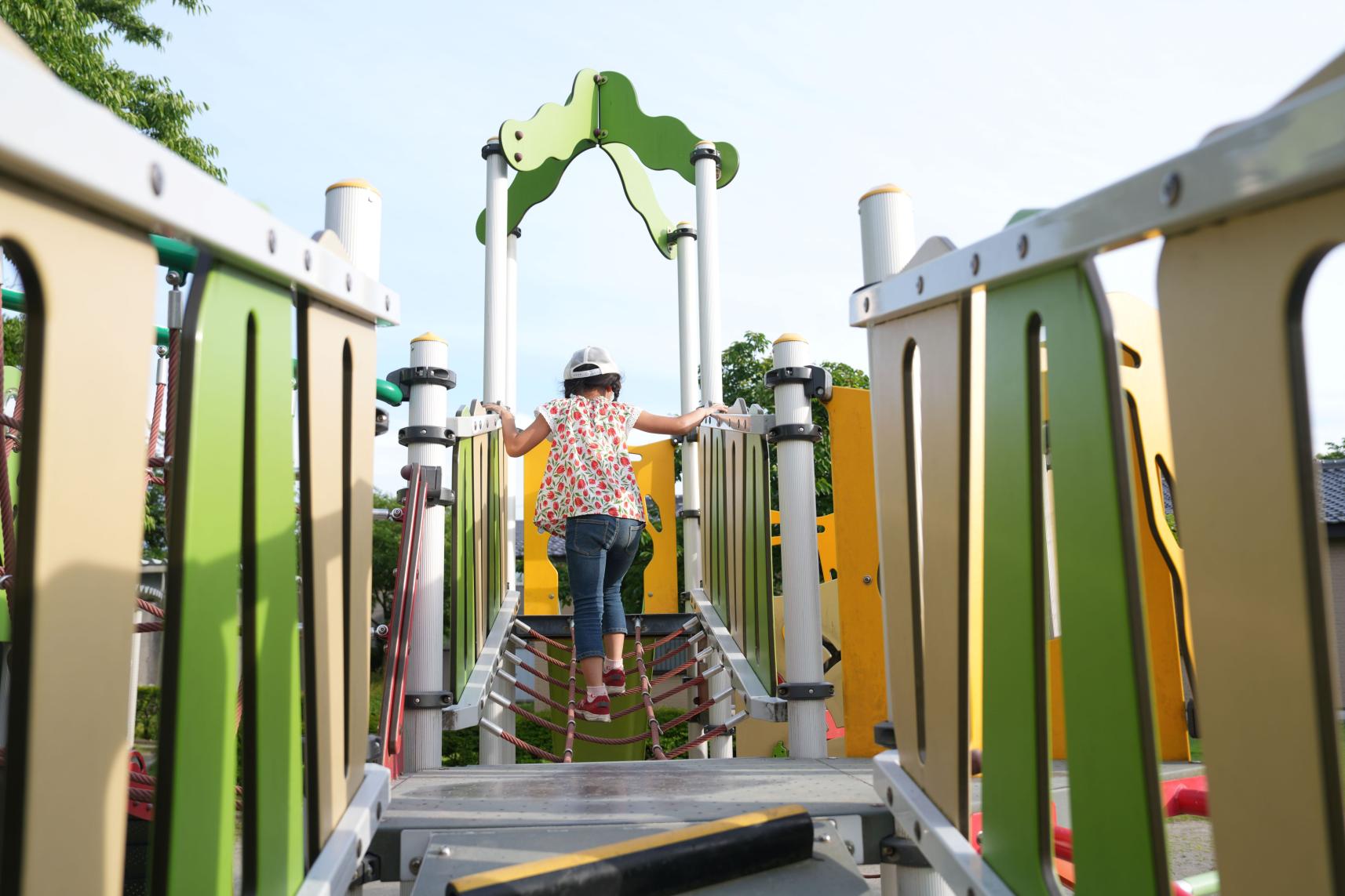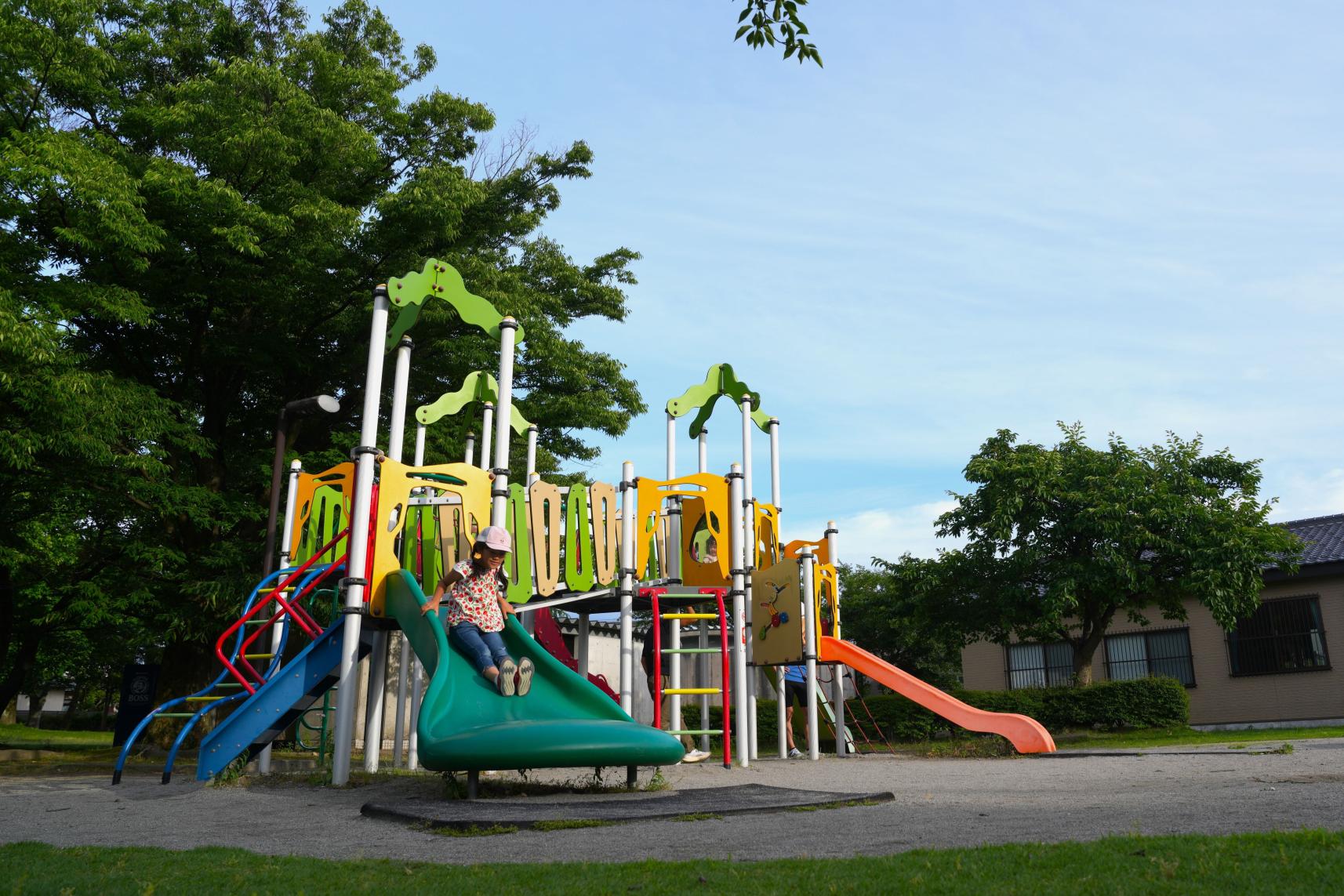 よちよち歩きの幼児でも安心して遊べる小さめの滑り台や砂場、カラフルなアスレチック遊具には、複数の滑り台も!子供たちが楽しめる公園です。ぜひ、ご家族連れで訪れてみてください。