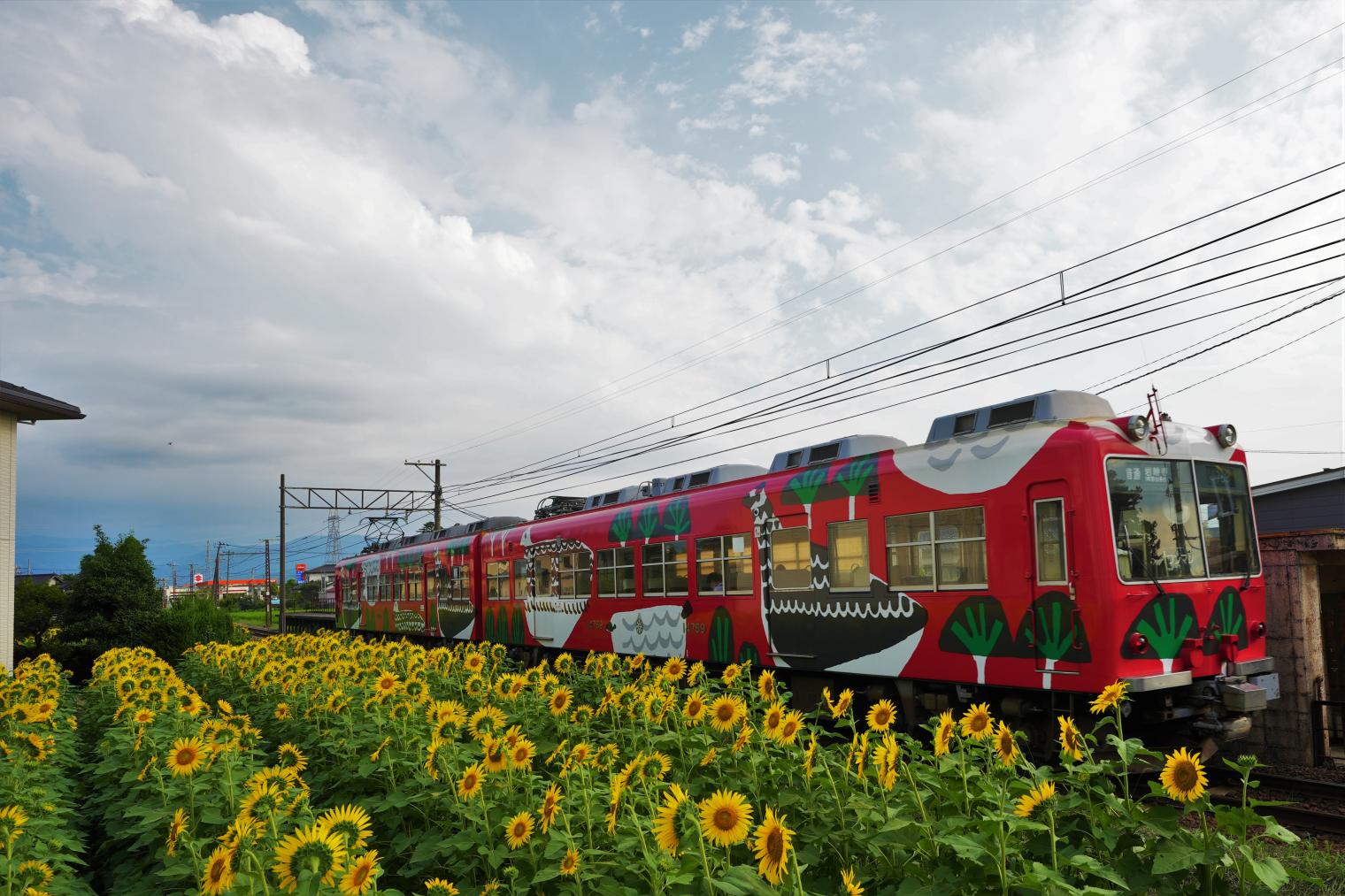 「“とやま模様”の電車」をはじめ、「黄色と緑の“カボチャ電車”」や「白色の“ダイコン電車”」など、多彩な電車がこの沿線を走ります。ヒマワリ畑と個性豊かな電車、そして背景にそびえる立山連峰!この季節だけの特別なコラボレーションを、ぜひ現地でお楽しみください!