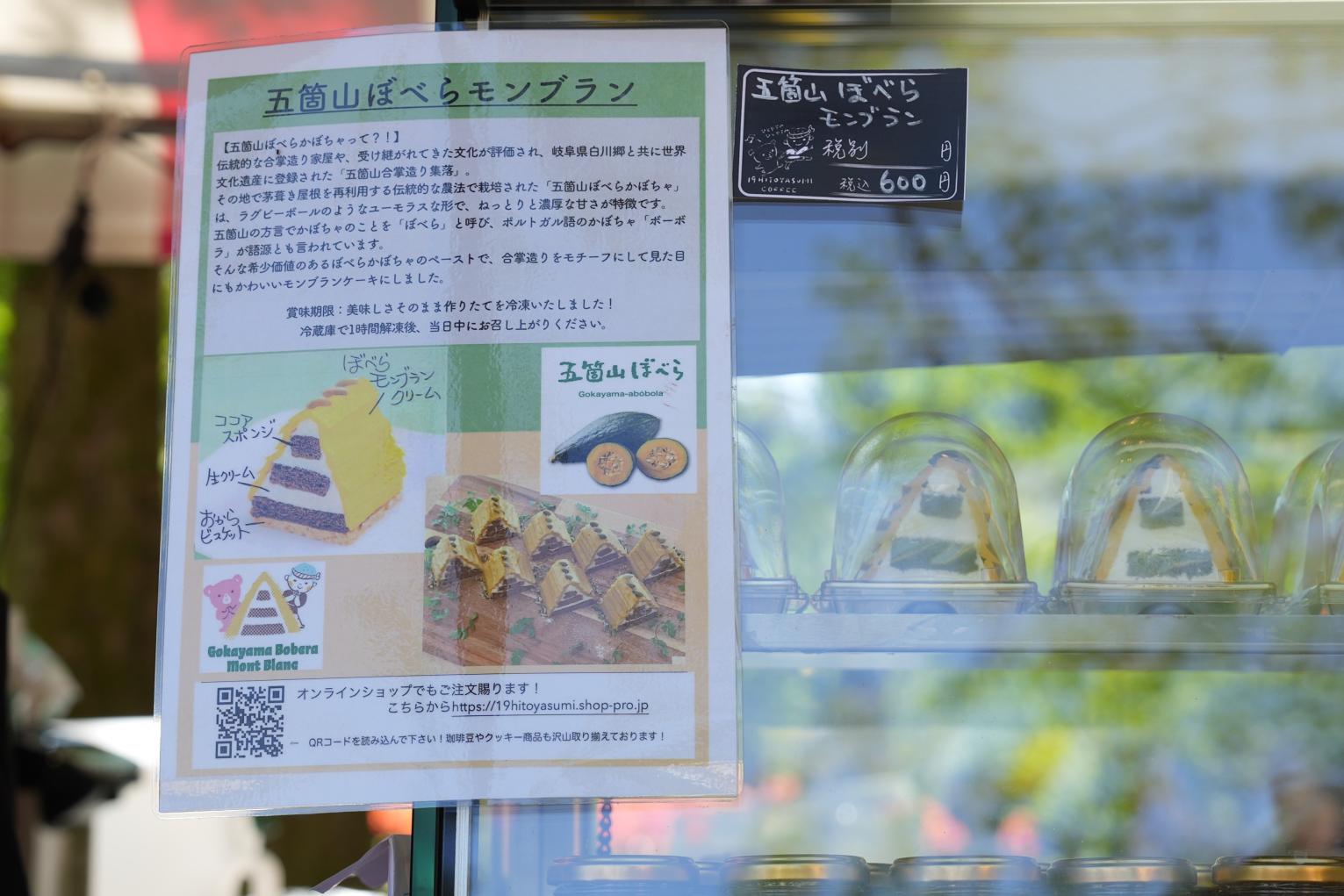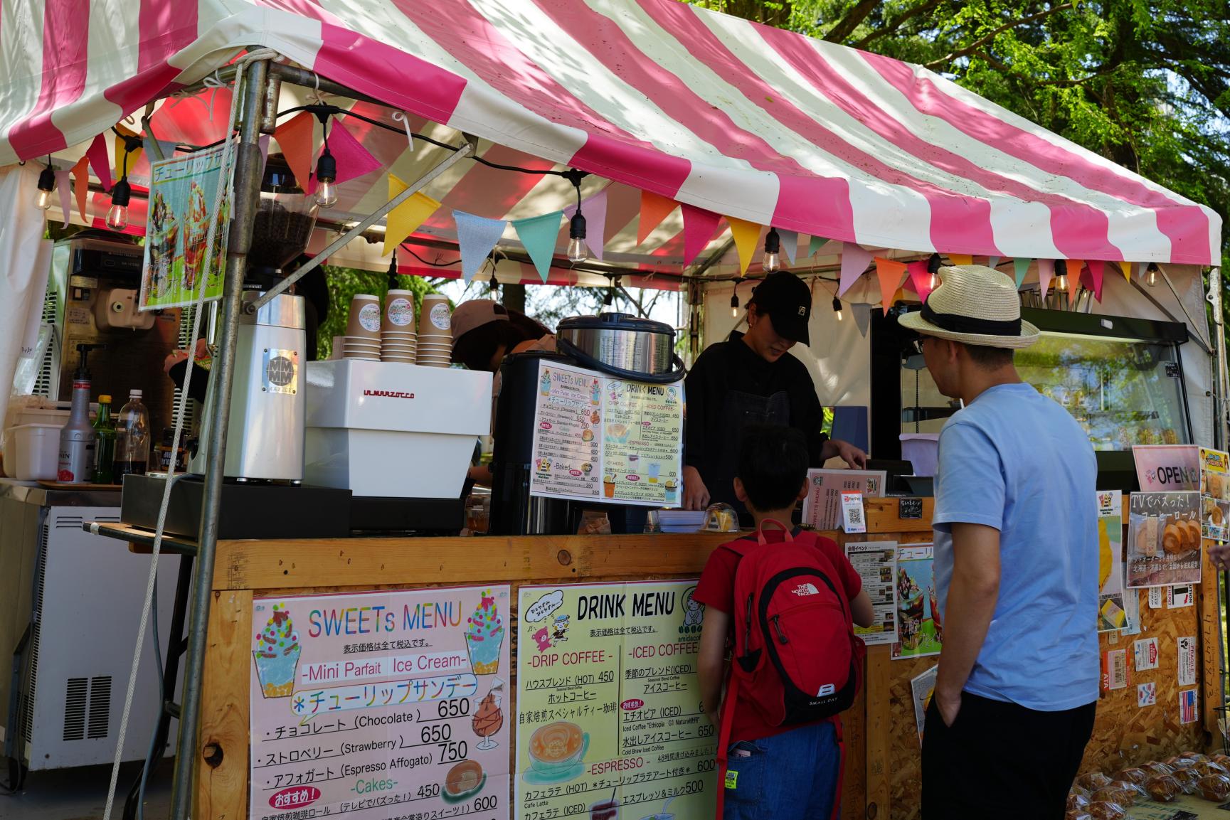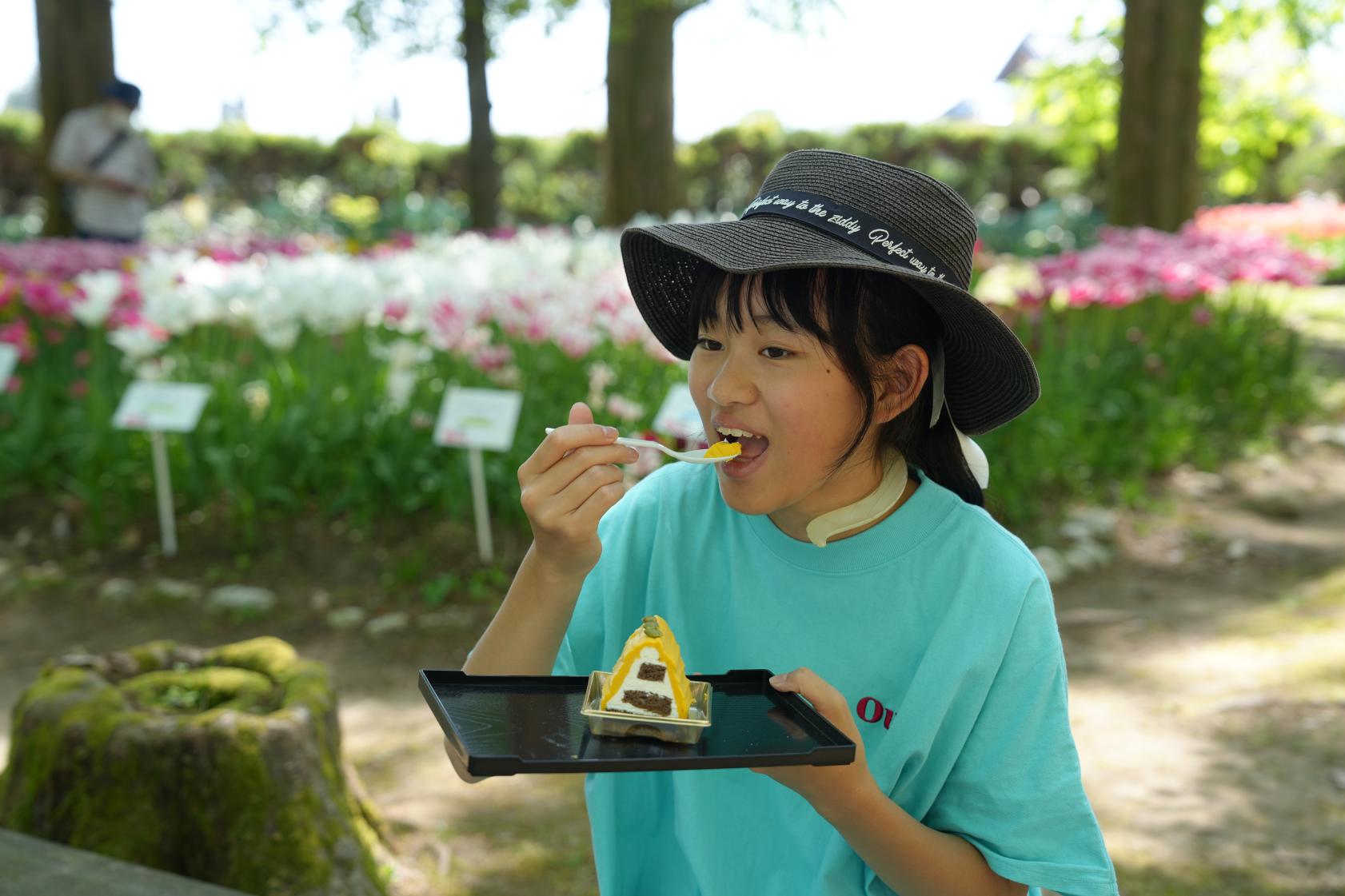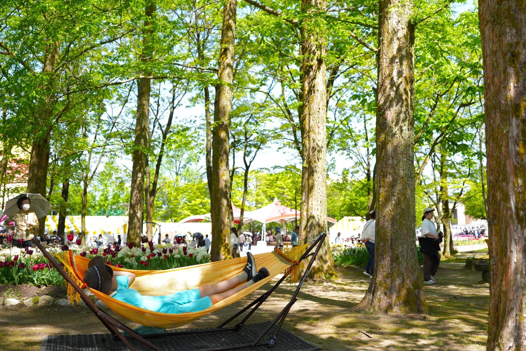 中央のステージ横にある「こもれびガーデン」。新緑が美しい木々の下、木漏れ日を感じながら過ごせる空間があります。チューリップやムスカリが咲き誇り、ハンモックやテーブルも設置され、ゆったりとくつろげるのが魅力です。期間中は気温が上がる日もあるため、ひと休みするのにちょうどよく、カフェのメニューも豊富で、パフェやアイスコーヒーなどを購入できます。合掌造りをイメージした「五箇山ぼべらモンブラン」も美味しいので、オススメです。