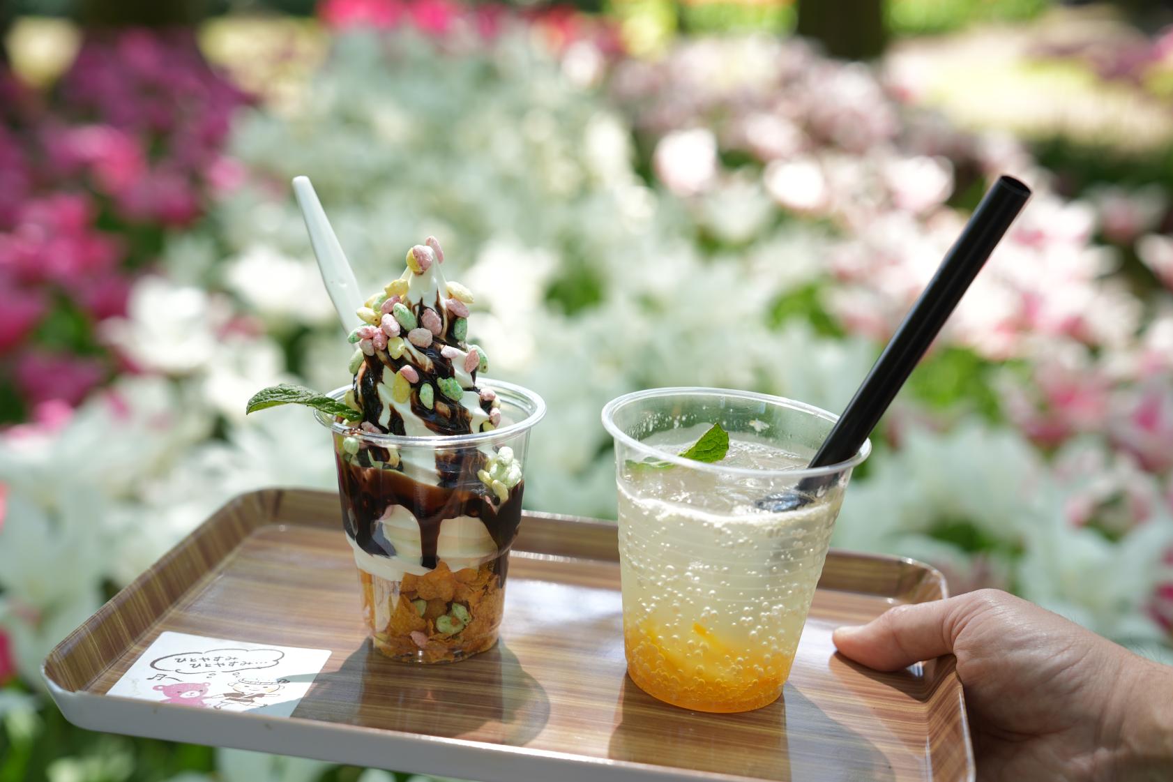 大花壇の横には、テイクアウトコーナーがあります。デザートには、「チューリップソフト」をぜひ!可愛いピンク色のソフトクリームは、チューリップの花のエキスが入ったシロップが使われているそうです。他にも、気になる「ホタルイカソフト」など、富山県ご当地ソフトも販売されています。