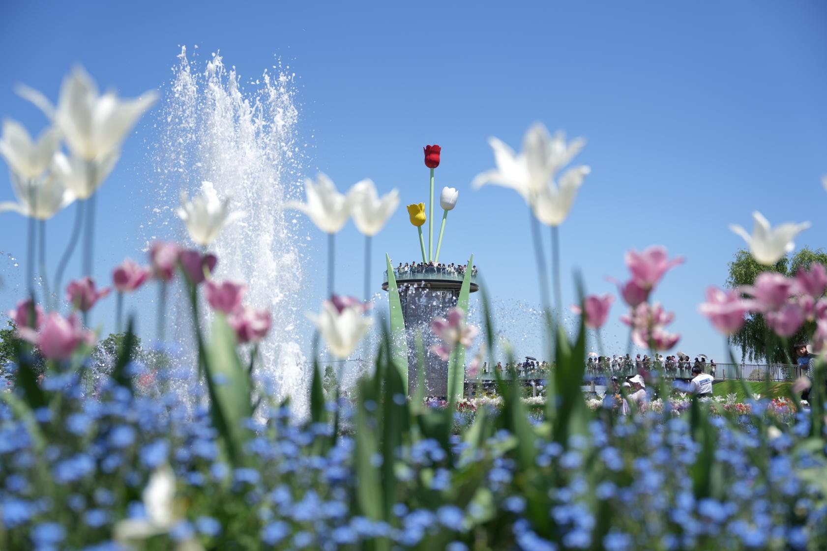 まずは、中央ステージ前に広がる「噴水とチューリップの大花壇」の景色です。噴水の水しぶきがきらめく青空の下、色とりどりのチューリップが一面に咲き誇る大花壇を堪能してください。チューリップタワーからの眺めも素晴らしいですが、ここから見上げるタワーと花壇のコントラストも、美しく、毎年、感動しています。