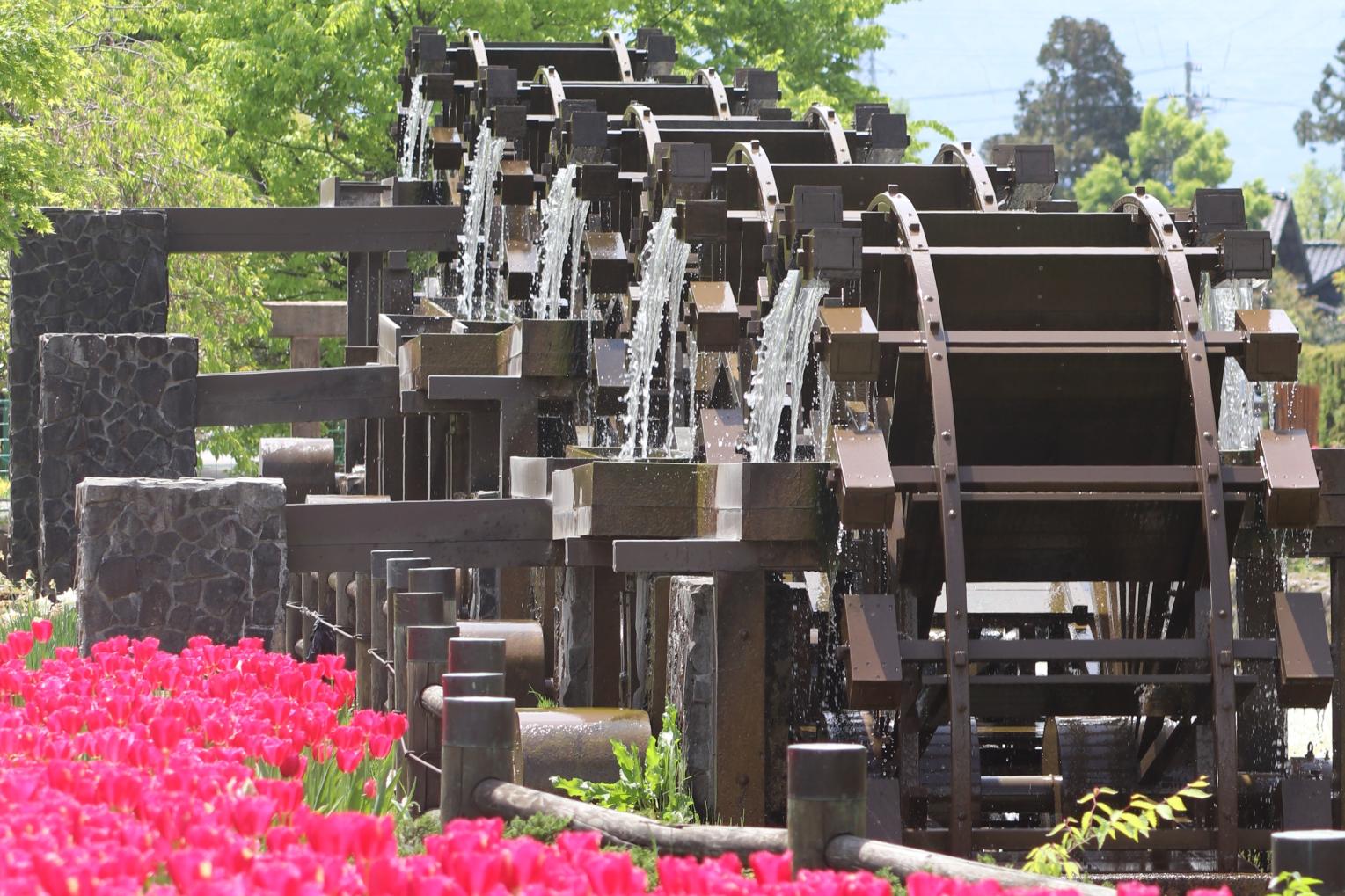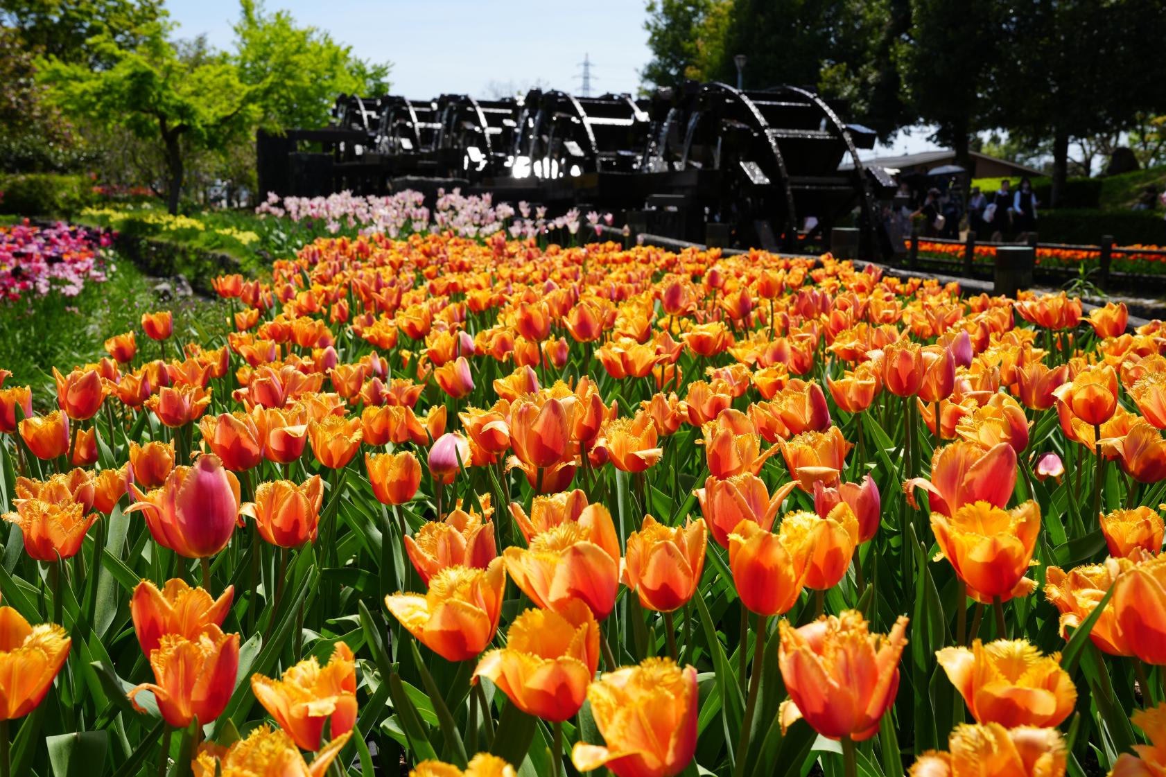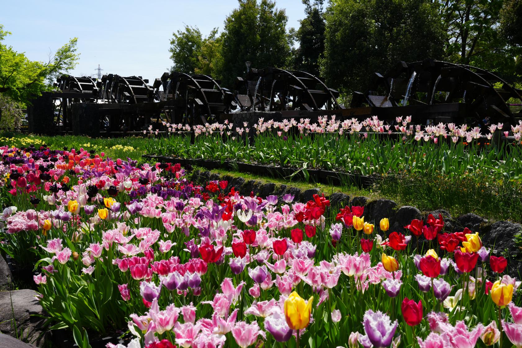 会場の公園内には、「日本最大級の五連揚水水車」があり、水車がゆっくりと回る風景と、美しく咲き誇るチューリップのコラボレーションを見ることが出来ます。この場所ならではの景色ですね。