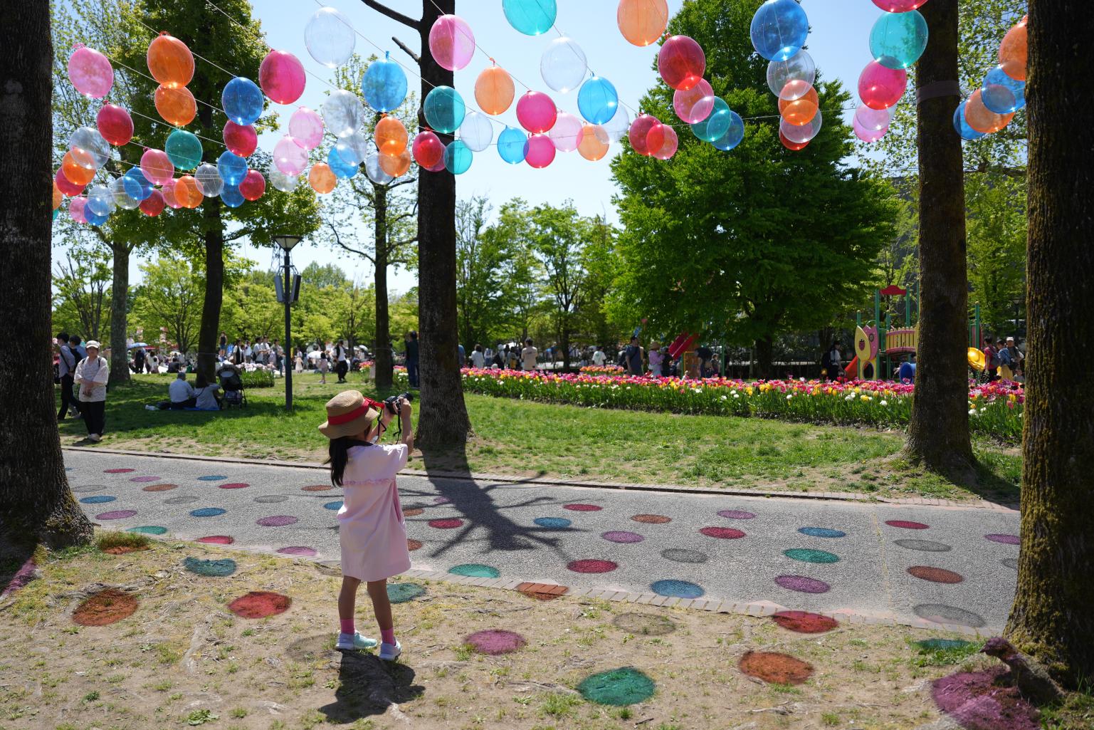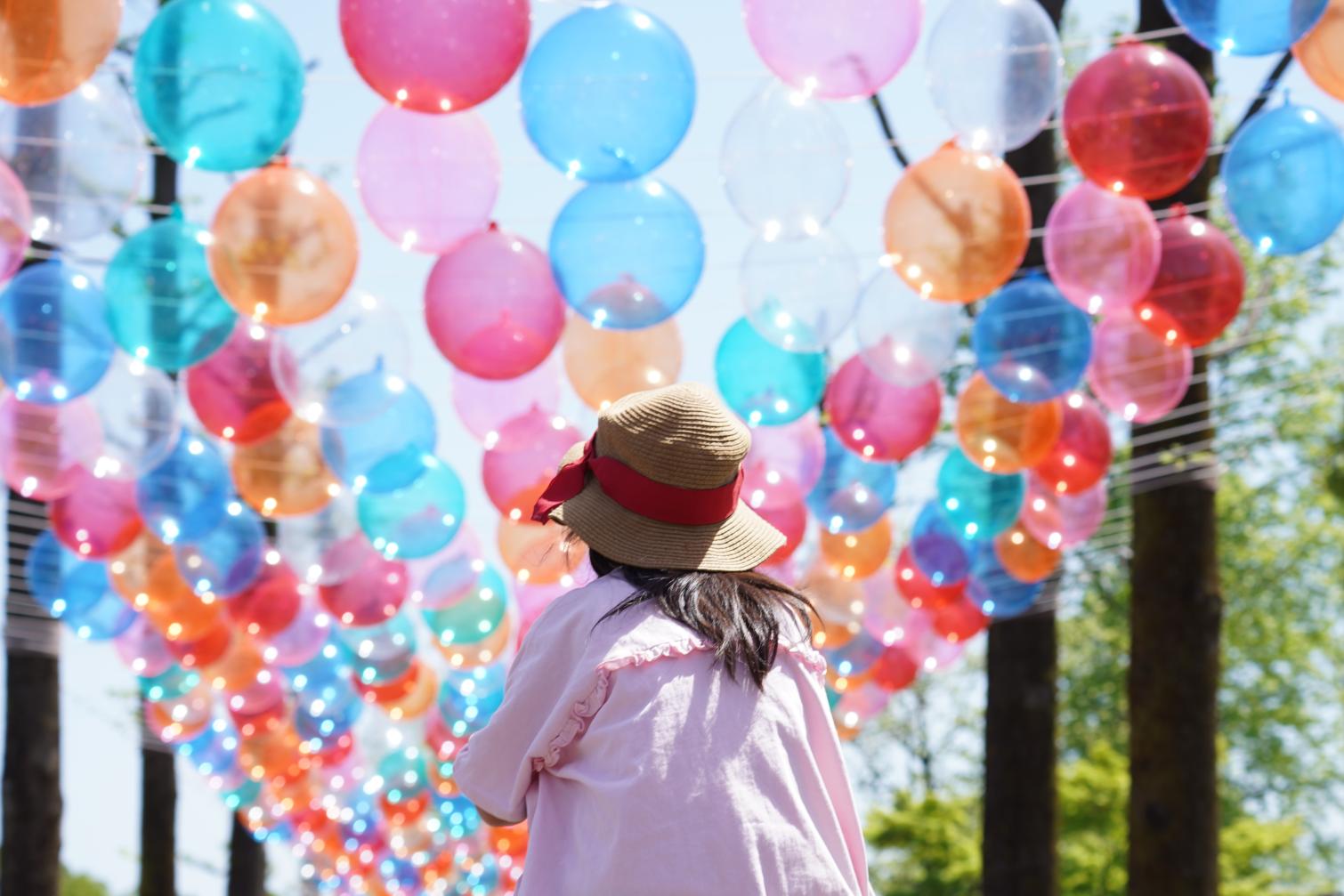 北門からチューリップ四季彩館へ向かう途中、色とりどりのバルーンが浮かぶ映えスポットがあります。地面に映ったカラフルな影にも興味をそそられ、写真を撮りたくなります。