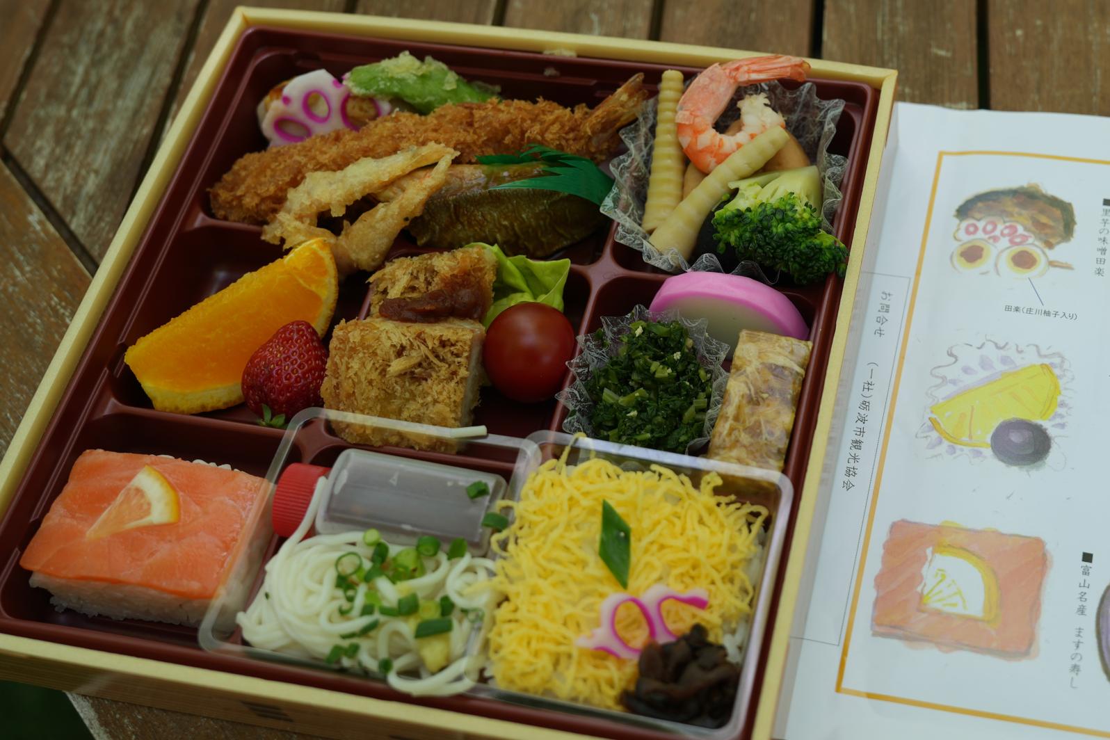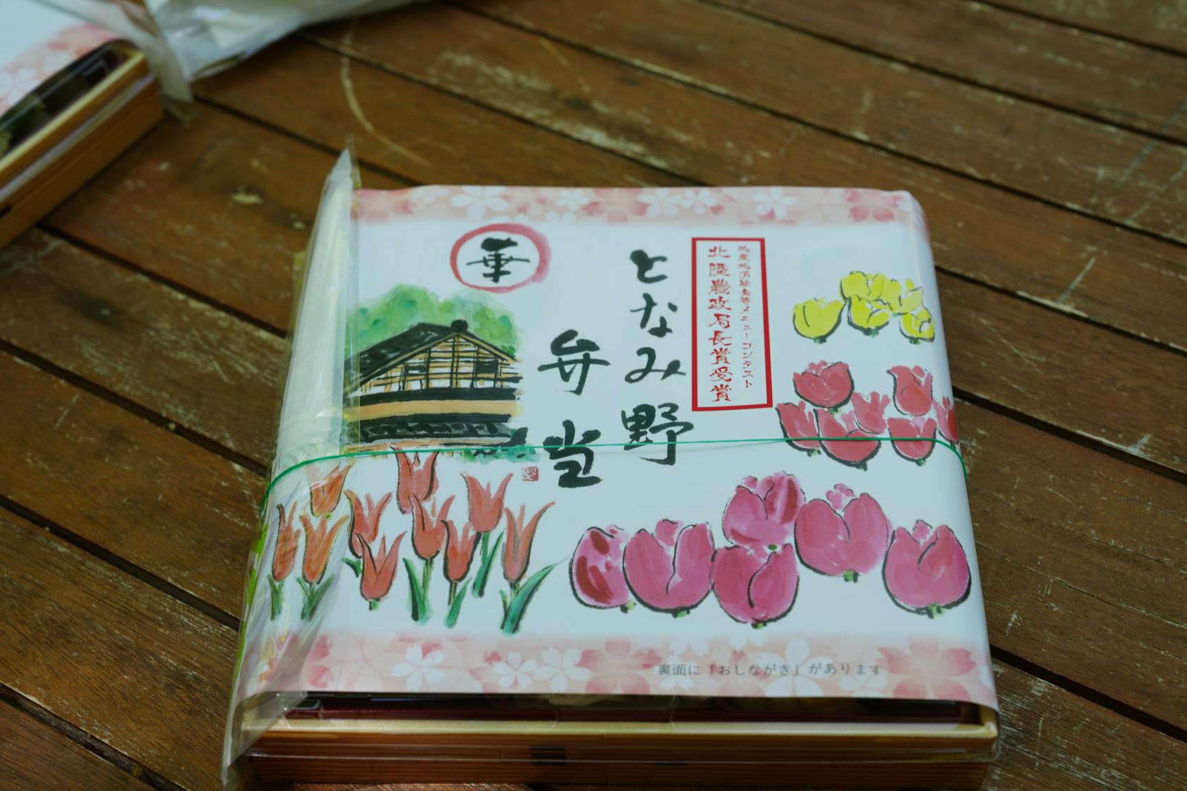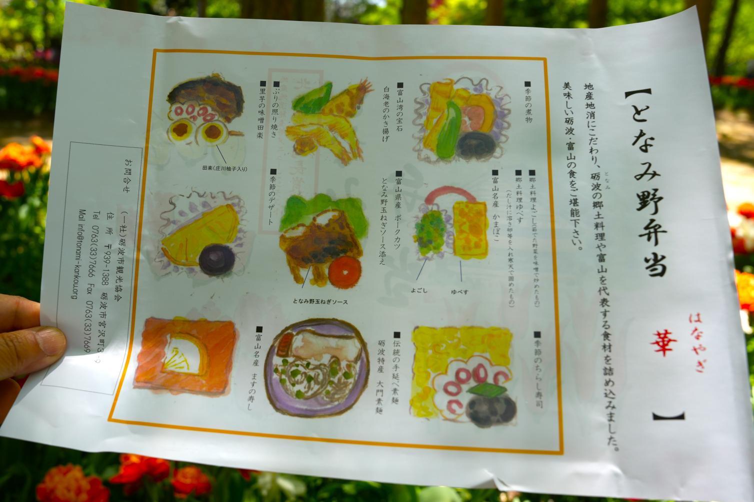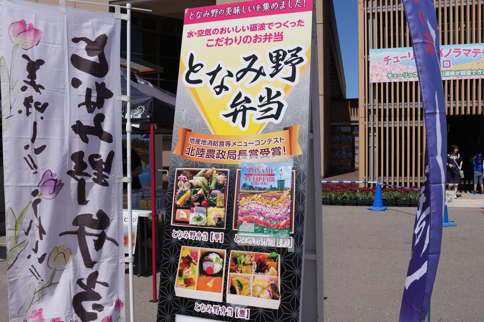 北門からすぐ、円形花壇のそばで「となみ野弁当」が販売されています。今回は、「となみ野弁当(華)」を頂きました。ますの寿し、白海老のかき揚げ、砺波特産の大門素麺など、富山県を代表する食材がふんだんに使われており、チューリップフェアに来たら、ぜひ、食べてほしいお弁当です。