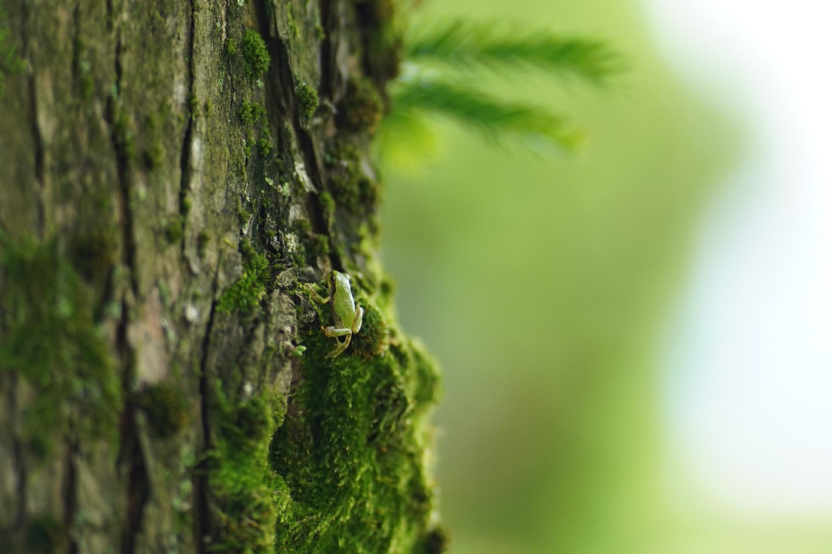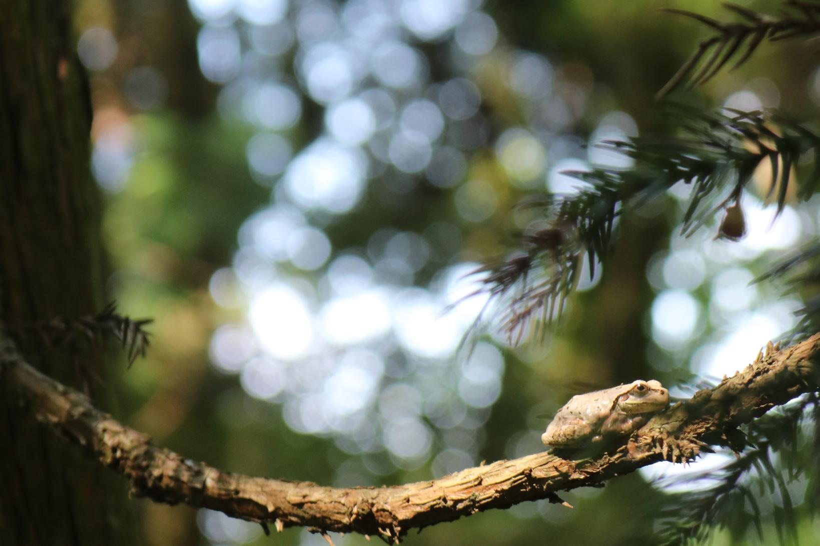 「沢スギ自然館」では、模型やパネル展示がありいろいろな視点から「杉沢の沢スギ」を知ることができます。自然館の横に、湧水地に生育するスギ林があり、夏でも涼しく森林浴しながら散策を!植物や木の上に、カエルも発見しました。