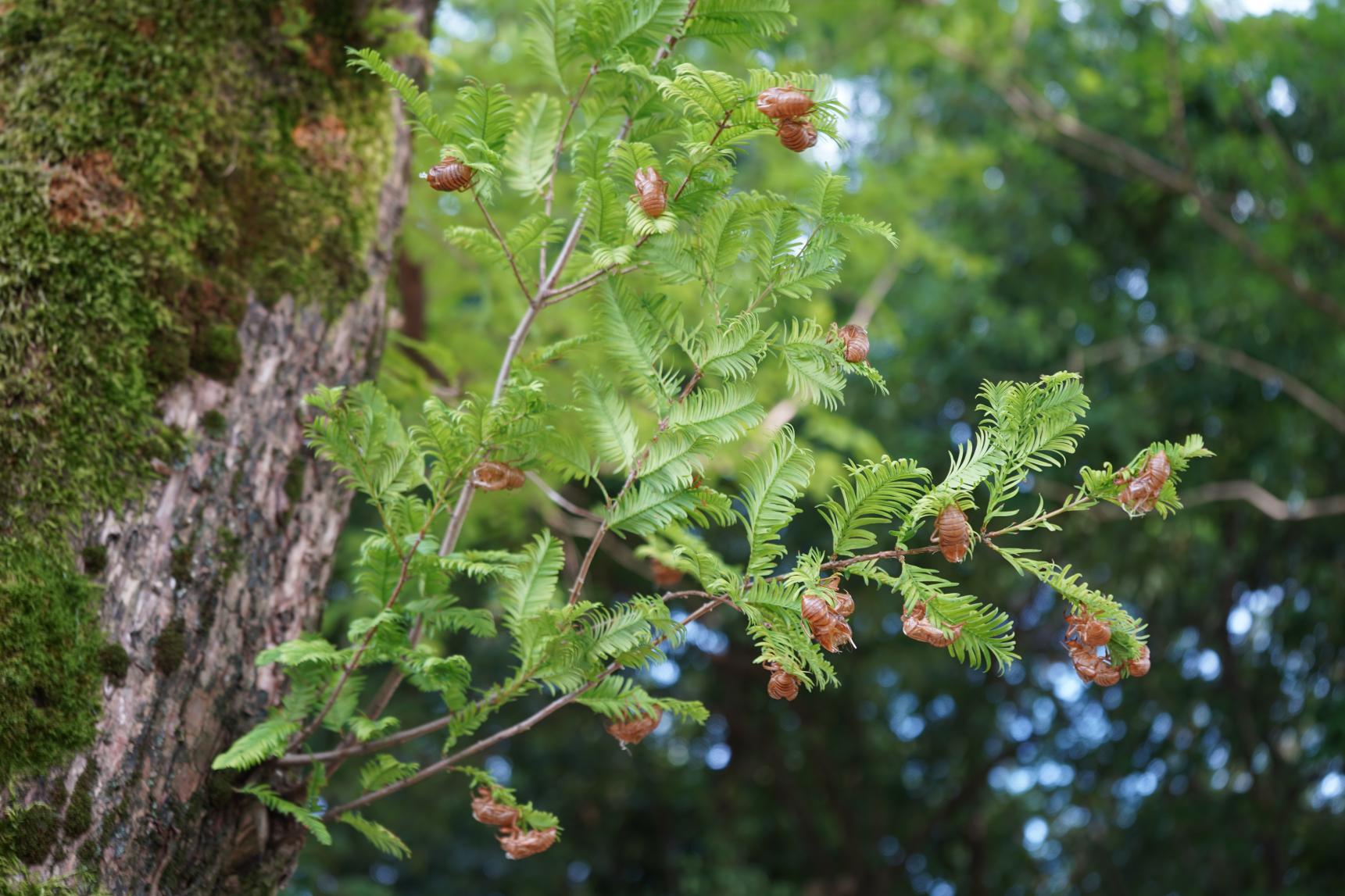 余談ですが、抜け殻があるということは、セミの羽化を見られる場所なのです。小川を抜けていくと池があります。池の周辺の「メタセコイヤ」の木々に注目!雨上がりの夕方から夜、要チェックです!今、まさに羽化しているセミがいるかもしれません!「セミの羽化の観察」、夏の自由研究にいかがでしょうか?