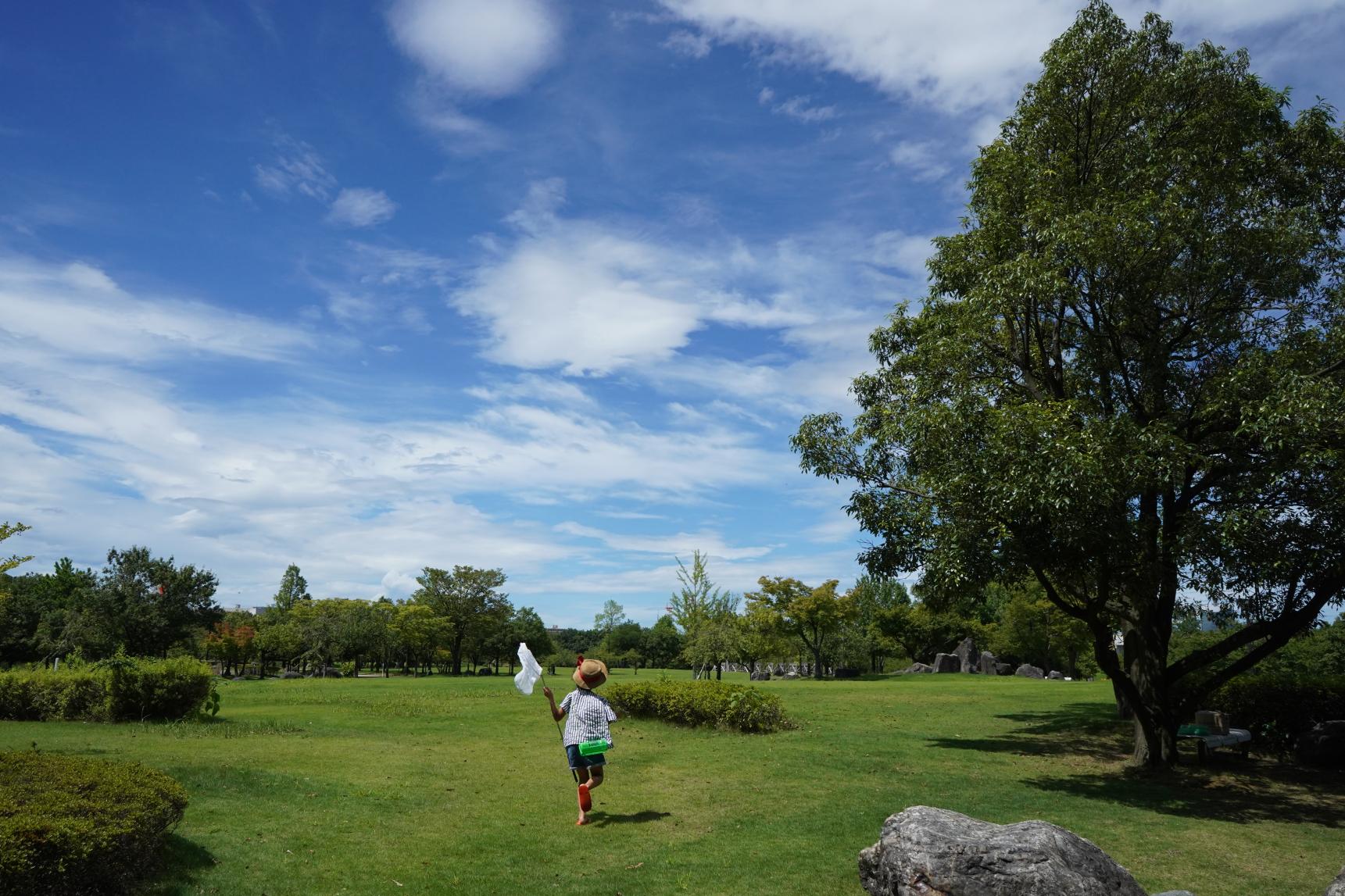 水遊びした後は、虫探しも始まりました。トンボ、セミ、蝶々などを発見!木々や小川、池のある公園です。もっといろいろな生き物に出会えるかもしれません。夏休みに行ったときは、セミの抜け殻が大量に…。