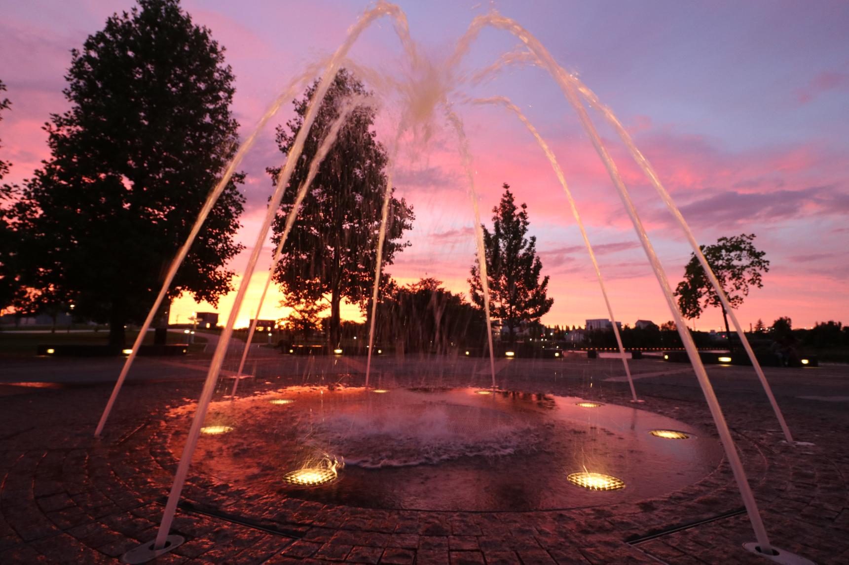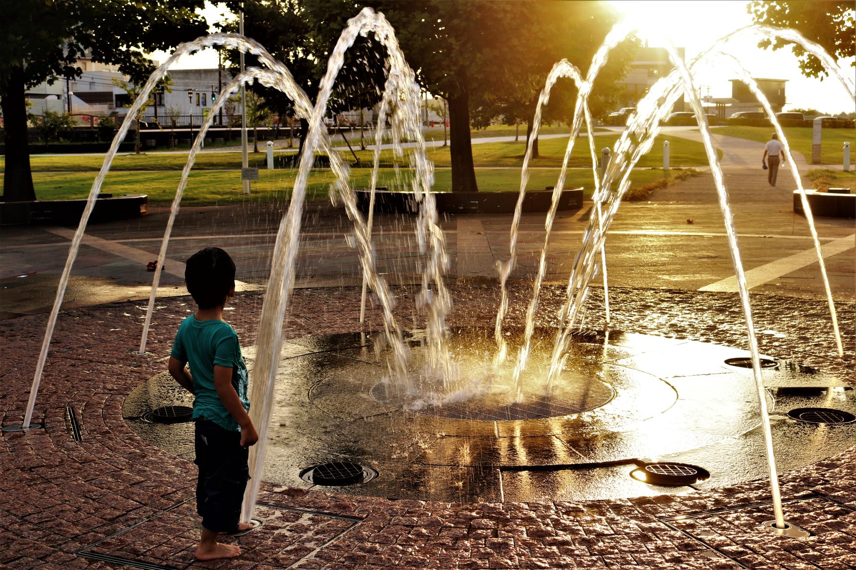 日中、赤ちゃんのころからよくここで水遊びをしました。夕方、涼みにお出かけしたこともありました。その時、夕陽が噴水にあたり、とても綺麗なことを知りました。夕方から日没にかけても素敵な景色に出会える場所なのです!