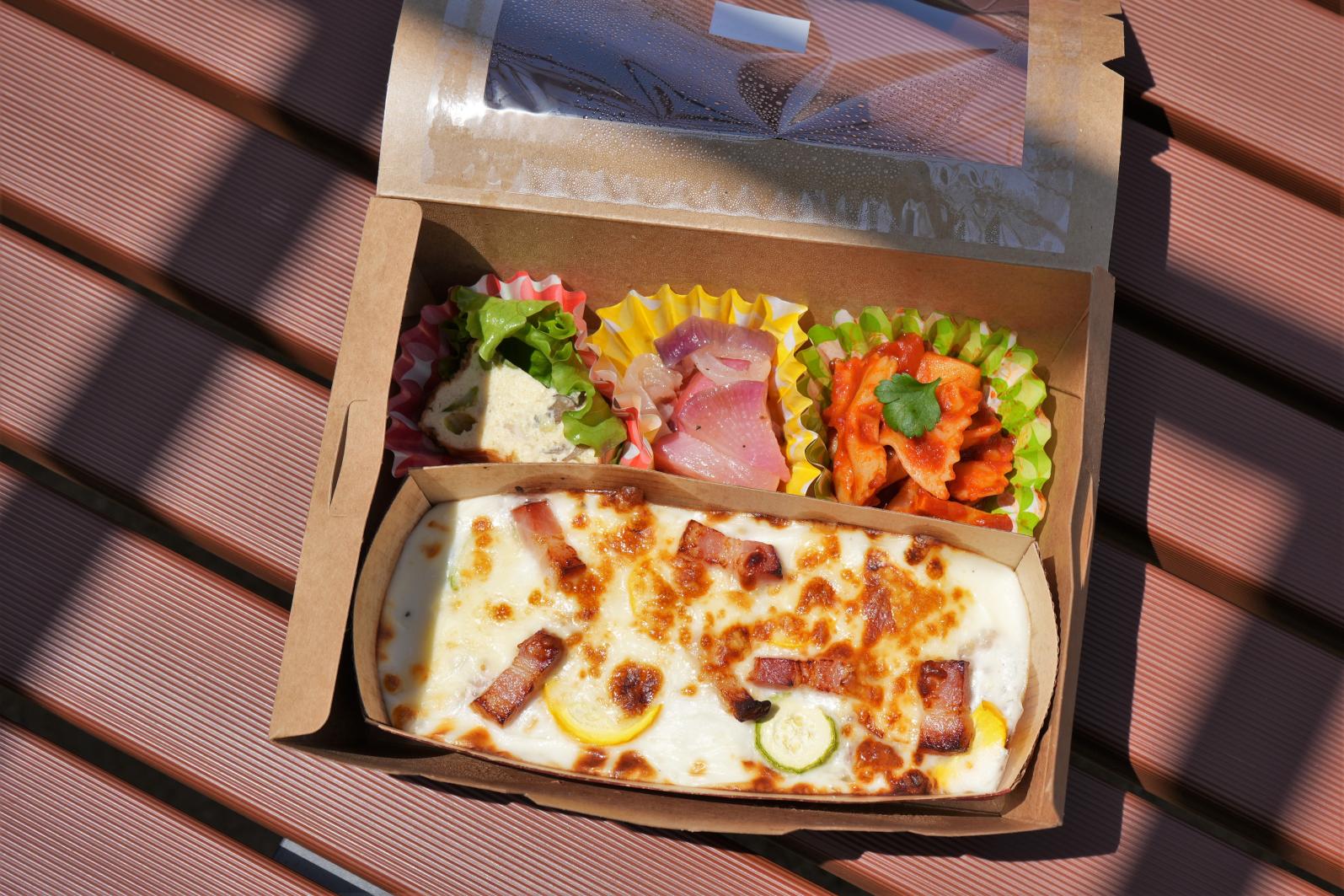 この日は、「ドリアランチBOX」、人気の2段ボックス弁当「グラチネBOX」を頂きました。子供たちにも大好評!「ドリアランチBOX」は、古代米を使ったご飯に入善産の野菜をたっぷり使ったベーコンの豆乳ソースドリア、手作りおかず3種が入っており、とても美味しかったです。