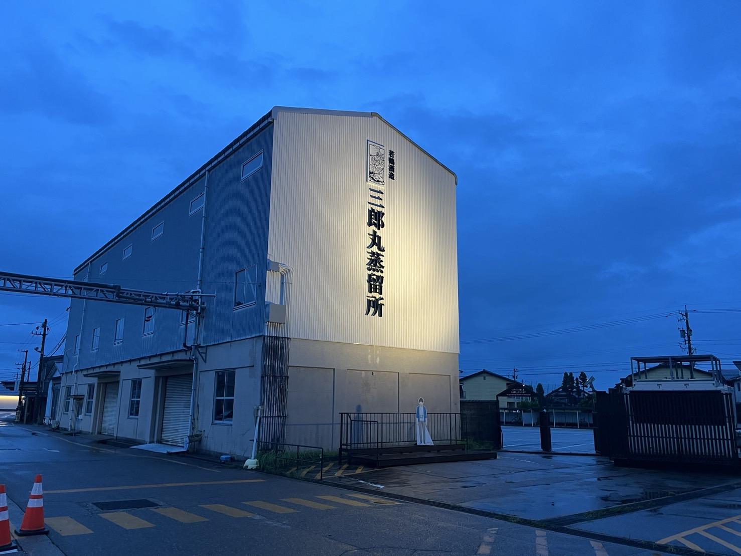 日も沈んだ18:00少し前、若鶴酒造三郎丸蒸留所を訪れると、施設内の建物が間接照明でライトアップされており、昼の雰囲気とはがらりと変わって優美で洒落た雰囲気を漂わせていた。