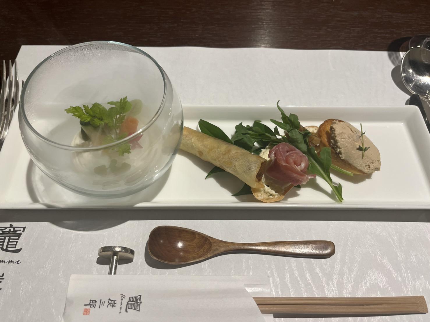 まずは前菜から。「となみ野玉葱ムースと射水桜鱒のスモーク」は器にカバーが掛けてあり、外すと煙が漂い、スモーキーな香りが広がる素敵な演出に驚く。スモークチップはウィスキー樽を再利用したもので、芳醇な香りの理由はそこにあった。味付けも自然で優しい。
