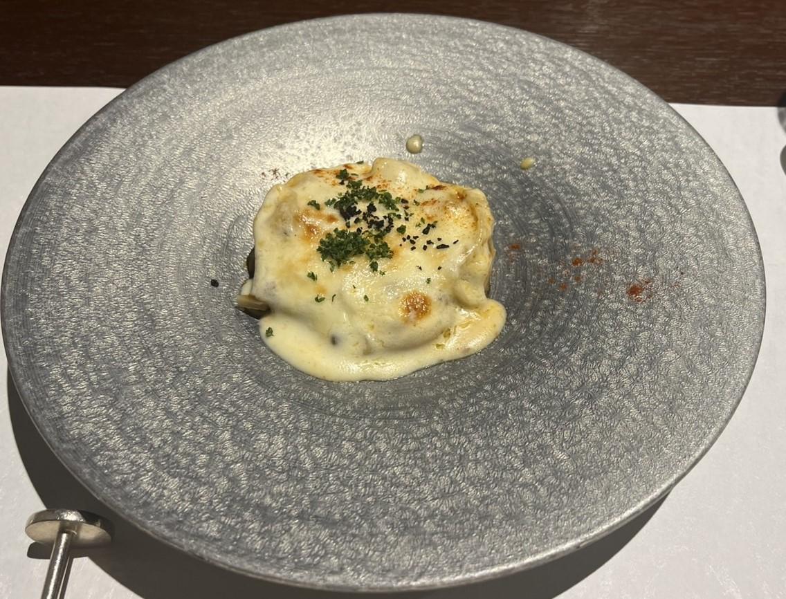 三品目は氷見うどんをイノシシ肉のボロネーゼでパスタ風に仕上げたグラタン。富山県産ジビエをここでも使用しており、ジビエへのこだわりと持続可能性を大切にする姿勢がうかがえる。コシがありのどごしの良い氷見うどんの洋風アレンジをしっかりと口の中で楽しんだ。