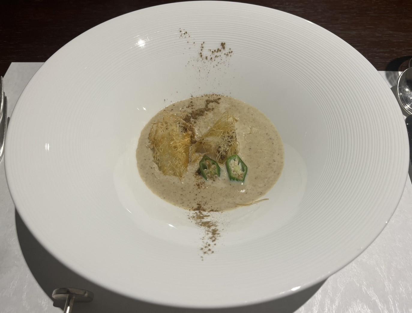 四品目はキジハタをトルコの食材「カダイフ」で巻いて焼き、キノコのスープで仕立てたもの。キノコのうま味が深く染み入った風味豊かなスープに、サクサクとしたカダイフの未体感な口触りが合わさる。口にスプーンを運ぶ手も軽快になる。