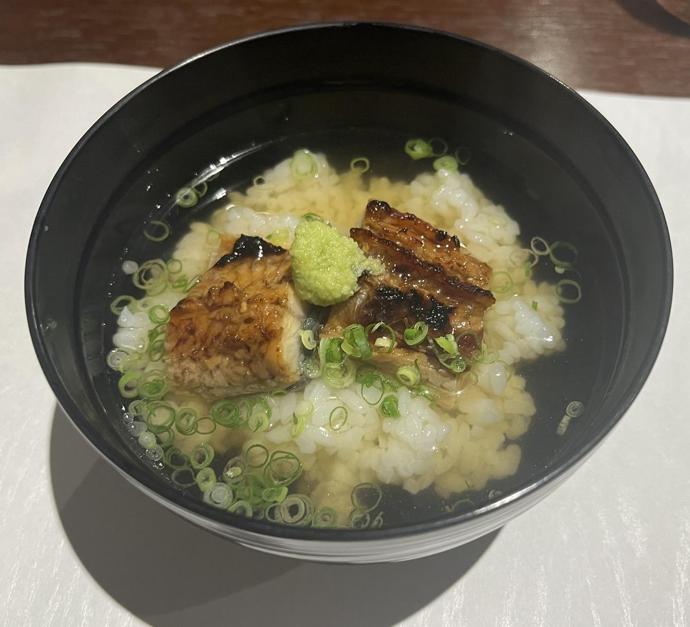 六品目、ご飯ものはかまど炊きのごはんを使ったうなぎのだし茶漬け。重厚なメインディッシュの後であったが、ちょうど良い塩梅の量で、ワサビを溶かし、さらさらとすっきりお腹に収められた。