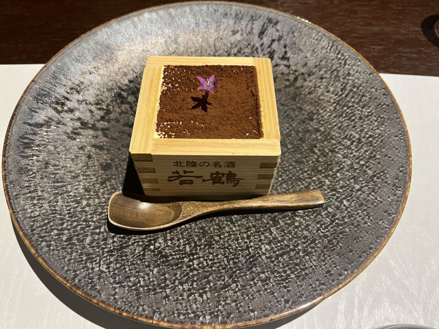 最後のデザートは、単品としても人気の高い「若鶴升の酒粕ティラミス」。日本酒の升に入ったティラミスに、ちょこんと花があしらえてあるのが可愛らしい。口にすると、滑らかなくちどけに、ほんのりと酒粕の風味が感じ取れる。チーズの濃厚さを感じる一方で、甘さ控えめでさっぱりとしており、コーヒーを挟みながら食べ終えた。