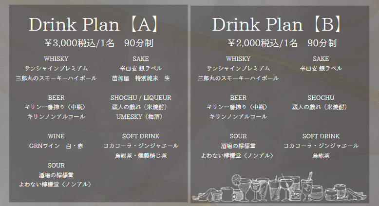 また、別料金で時間制飲み放題のドリンクプランもあり、三郎丸蒸留所のウィスキーやスモーキーハイボール、若鶴酒造の日本酒や焼酎などの地の酒を気兼ねなく楽しめる。お酒と食事のマリアージュ(調和)を堪能してみてはいかが。
