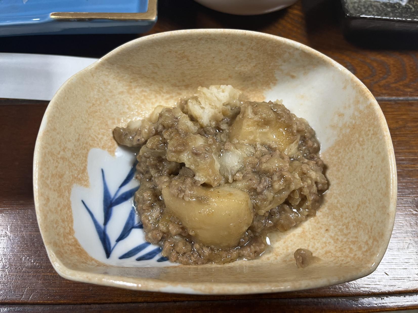 里芋のそぼろあんかけ煮は、旅館裏の自家農園で栽培している里芋を使っており、ネットの口コミでもよく紹介されていた品だ。口に入れると里芋のものすごい粘り気を感じ取れた。餅を食べているかと思うほどの粘力で、鶏肉のそぼろ、あんかけと絡み、絶妙なハーモニーを生み出している。