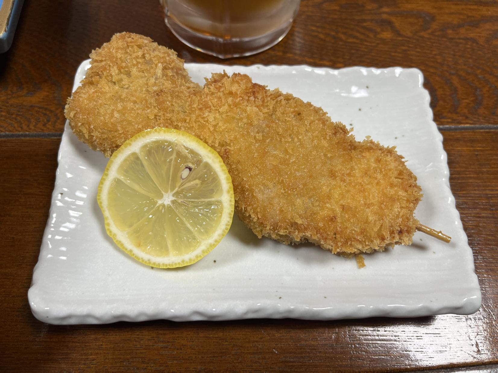揚げ物は串カツで、串に刺すサイズではないほどの大きなヒレカツと玉ねぎが揚げたて熱々で運ばれてくる。カツのジューシーな肉汁と玉ねぎの甘みにお腹も心も満たされる。