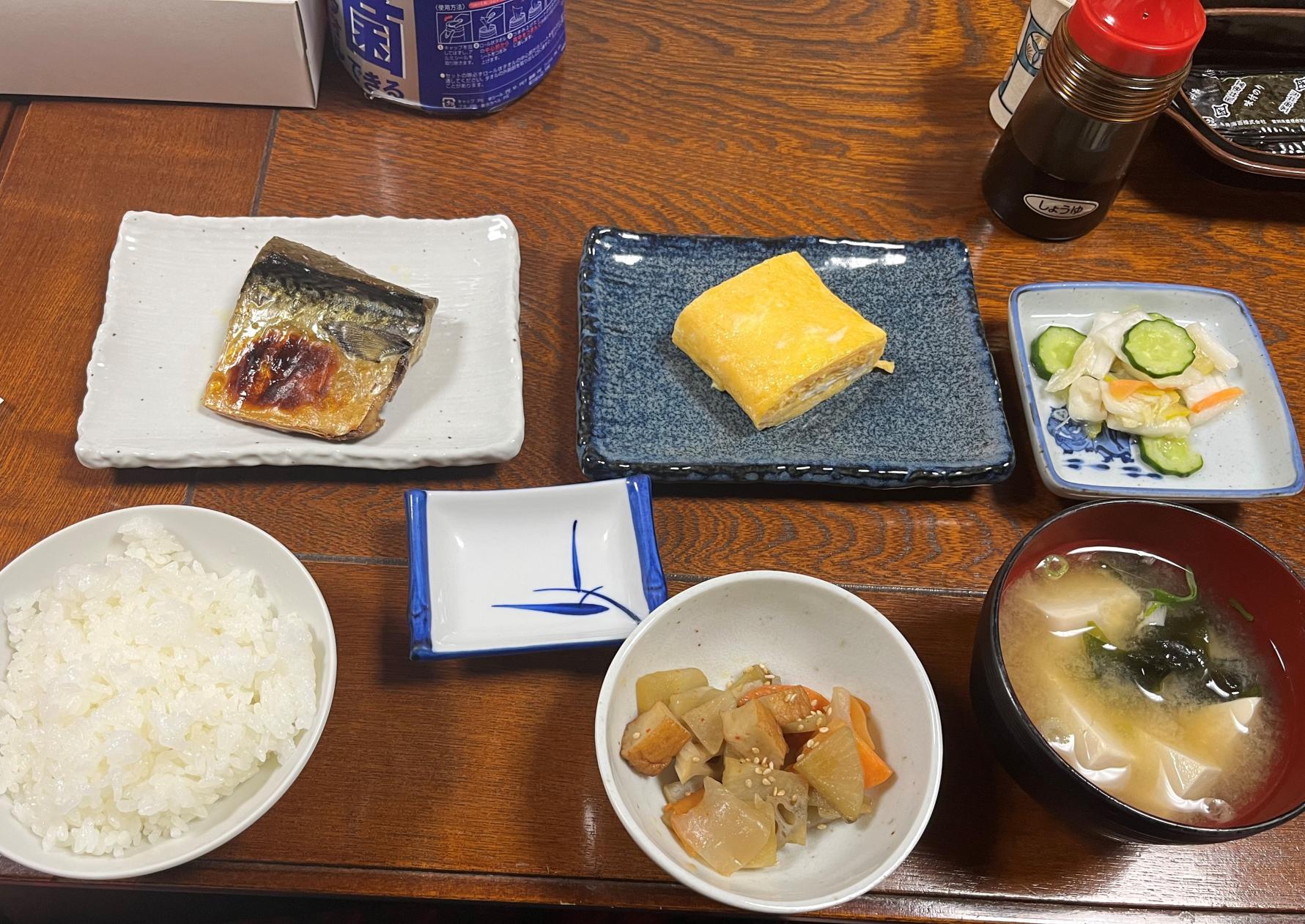 楽しい夜は過ぎて翌日。半分夢の世界の面持ちで、暴飲暴食との戦いを終えた胃をさすりながら朝食会場へ。席に座ると、焼き立ての卵焼きという朝の香りでぱちっと目が覚める。卵焼きを始め、サバの塩焼き、さつま揚げと大根等の煮物、とうふとわかめのみそ汁などが出来立てのうちに次々と運ばれてくる。みそ汁を一口すすると、柔らかな味わいが酔い疲れの身体に染みわたり、食欲が沸いてくる。旅館の朝食はご飯のおかわり必須というのは私見だが、この日も例に漏れず甘めの味付けの卵焼きをおかずに1杯、サバで2杯、煮物と漬物で3杯と、炊きたてつやつやの白ご飯を存分に食べ尽くした。