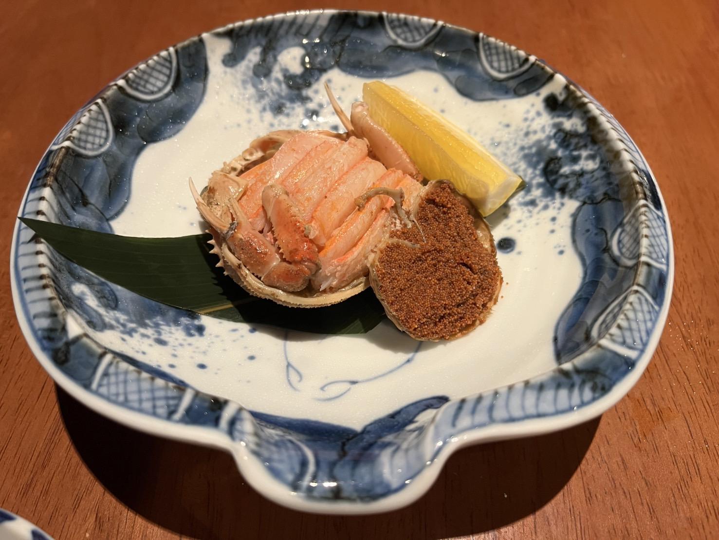 続いての香箱カニ(メスのズワイガニ)は、おおよそ11月上旬~12月下旬までの期間限定の地元民大好物な一品。「赤い宝石箱」と称されるコクのある身、プチプチした外子(そとこ=たまご)、身からほじくり出して味わう内子(うちこ=未成熟なたまご)、さらにカニみそ。しゃぶりつくすかのごとく平らげた。