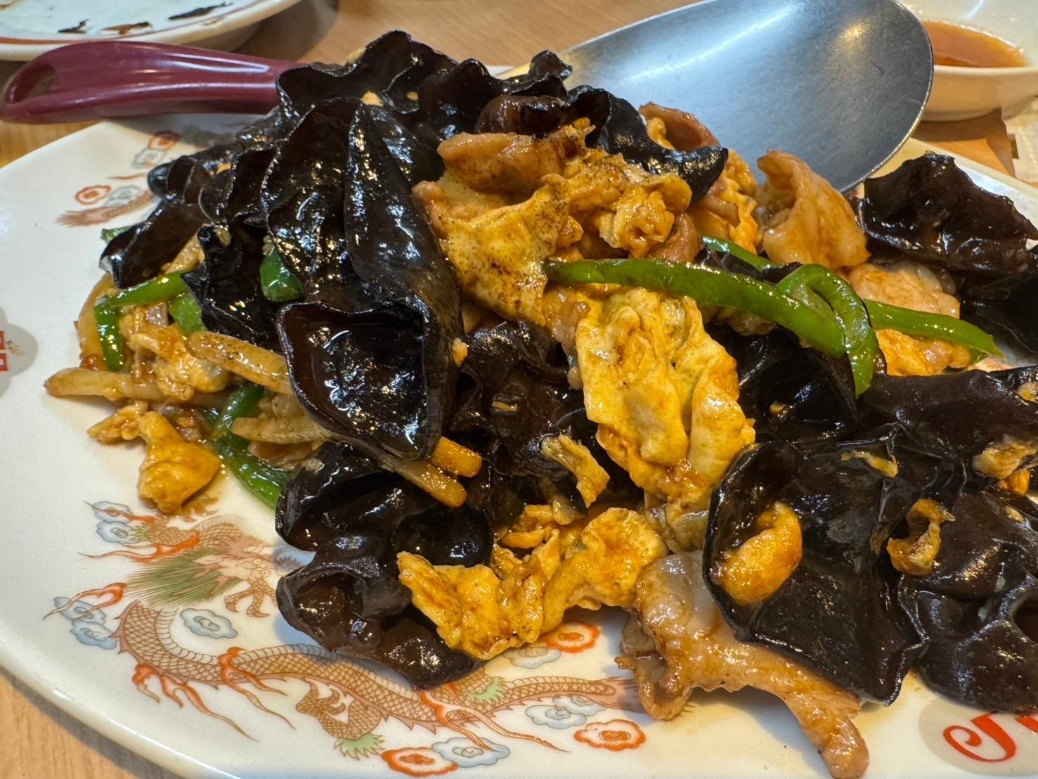 注文したのは、同店を語る上では外せない名物の「ムースーロー」。いわゆるキクラゲの卵炒めである。油をまとって照りつやの出た黒いキクラゲを卵、ピーマンやタケノコ、豚肉と一緒に取って口に運ぶ。薄味で食べやすく、柔らかでコリコリのキクラゲ、野菜のしっかりとした歯ごたえ、ふわりとした卵とそれぞれの味を噛みしめる。