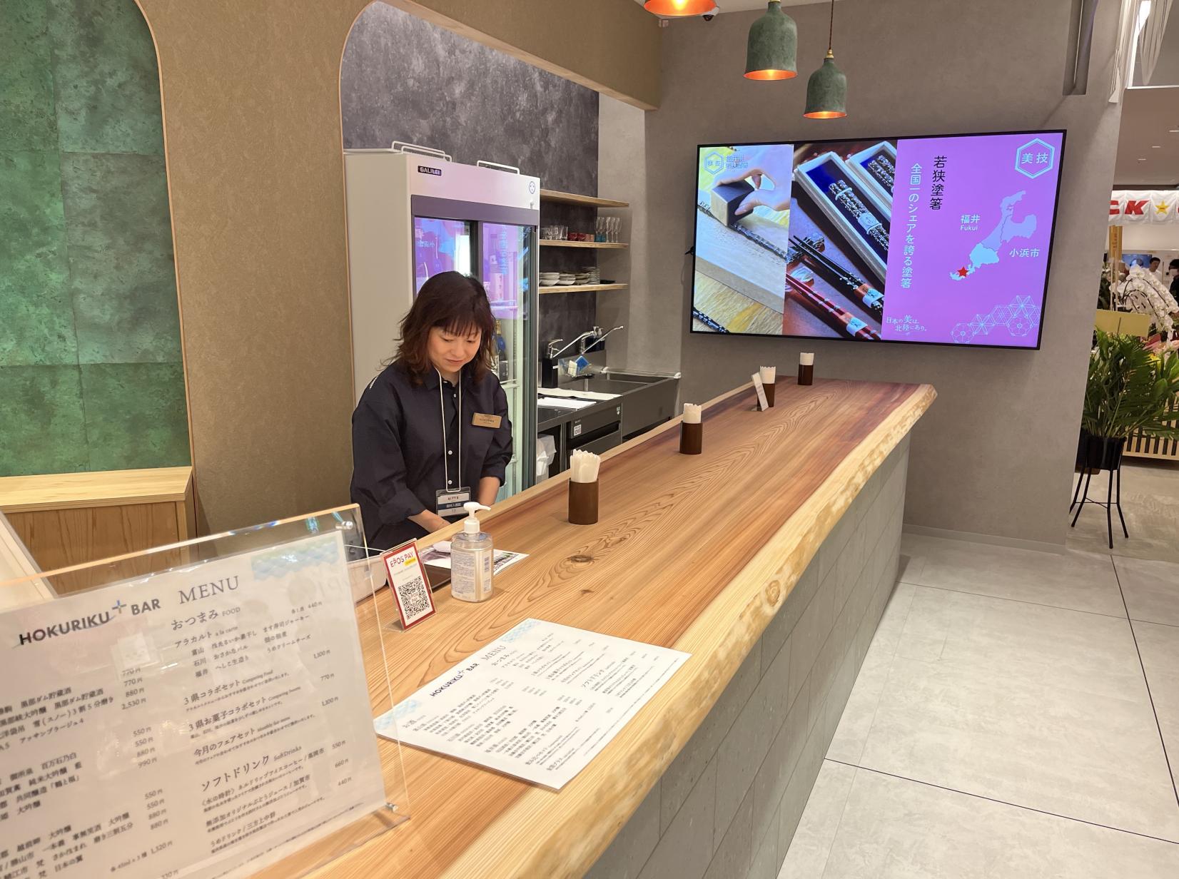 「KITTE大阪」は、旧大阪中央郵便局周辺を再開発した日本郵便の「JPタワービル」内にある商業施設で、JR大阪駅西口に直結している。38階建てのうち、同施設は地下1階から6階までを占め、飲食や衣類、雑貨やアミューズメントなど約100店が出店する。そのうちの一つの「HOKURIKU+」は、日本各地のアンテナショップが集結する2階に店を構えた。約240㎡の売り場は、北陸の雰囲気に包まれながら地酒とつまみを楽しめるバーエリア、特産品や伝統工芸品等の物販エリア、県外や外国人観光客への観光情報発信エリア、3県のイベントスペースの4つで構成されている。