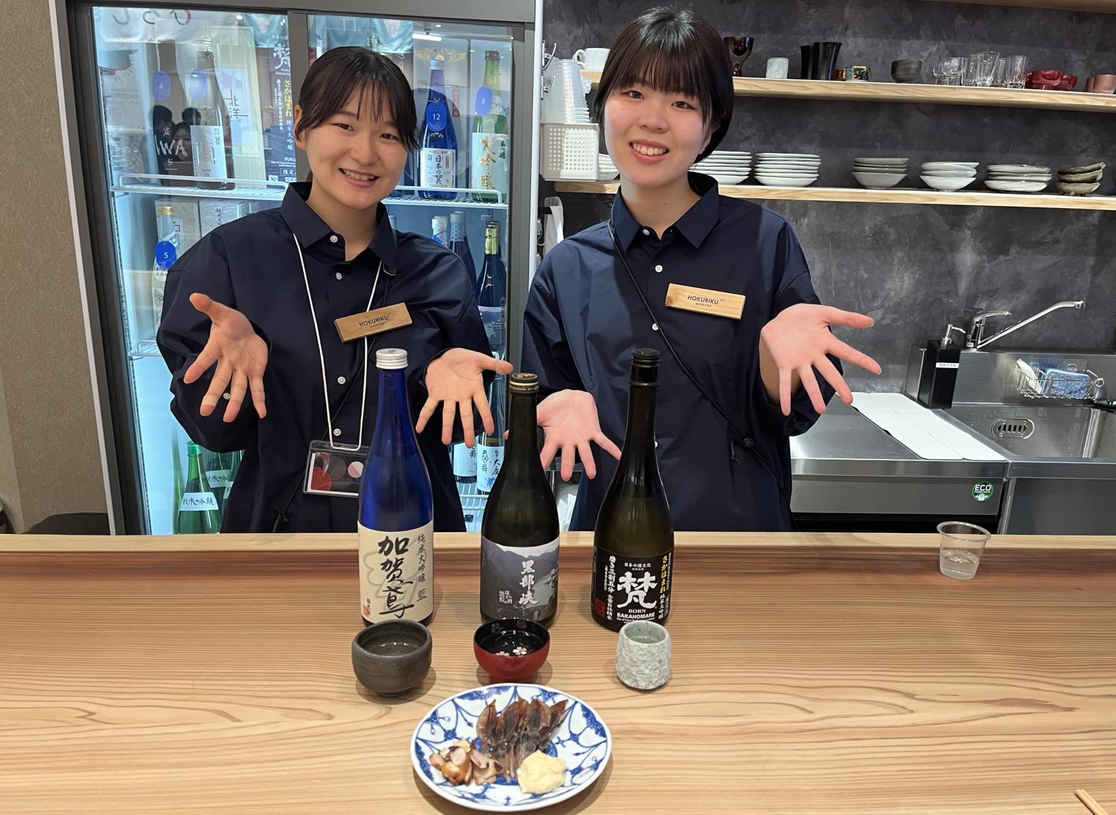 飲み比べセットは高岡漆器に「黒部峡(くろべきょう)」、珠洲(すず)焼に「加賀鳶(かがとび)」、笏谷石に「梵(ぼん)さかほまれ磨き三割五分」と、各県の工芸品の杯に地酒が注がれており、贅沢なひと時を演出している。おつまみセットは、九谷焼の器にほたるいかの素干し(富山)、いかのスモーク(石川)、うめクリームチーズ(福井)と各県おすすめの酒の肴が盛られている。