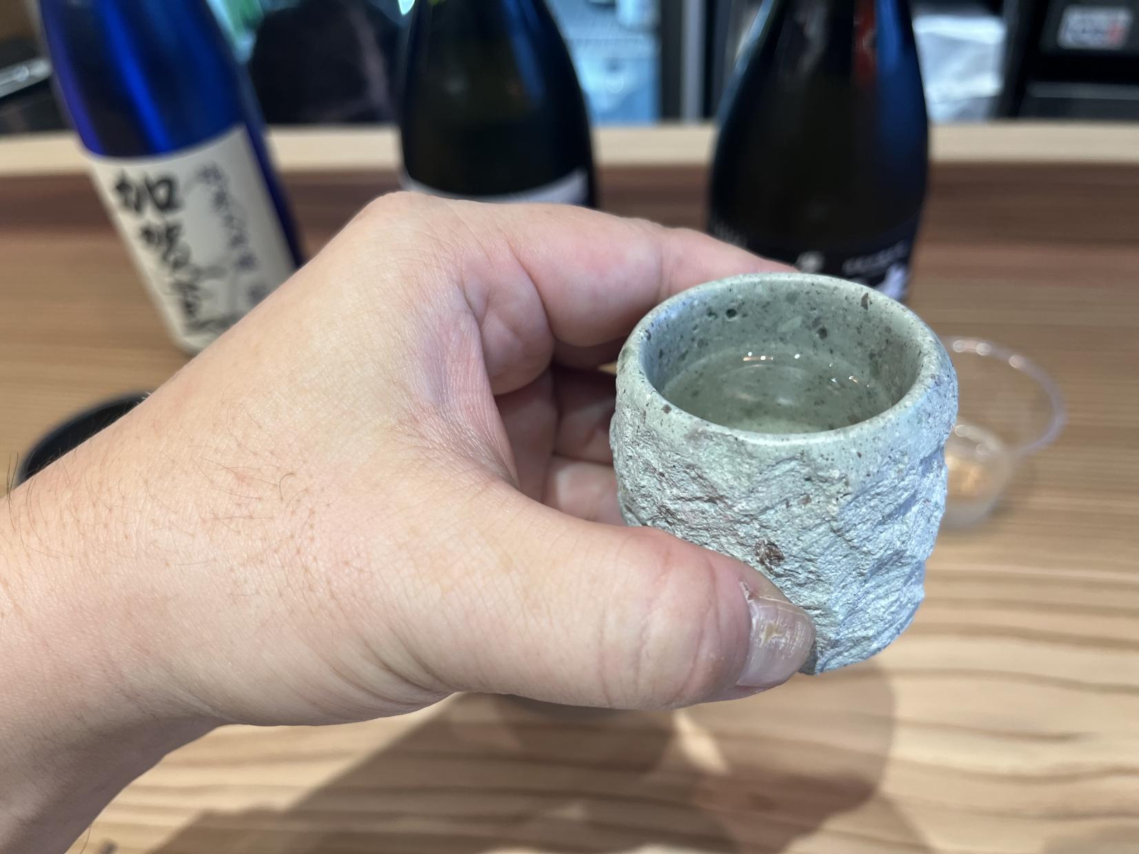 石川県の加賀鳶は、キレが良くふっくらとした上品な飲み口で、噛めば噛むほど味が出るイカのスモークとの相性は抜群だ。能登半島地震の復興に思いを馳せながら、珠洲焼の杯を傾ける。