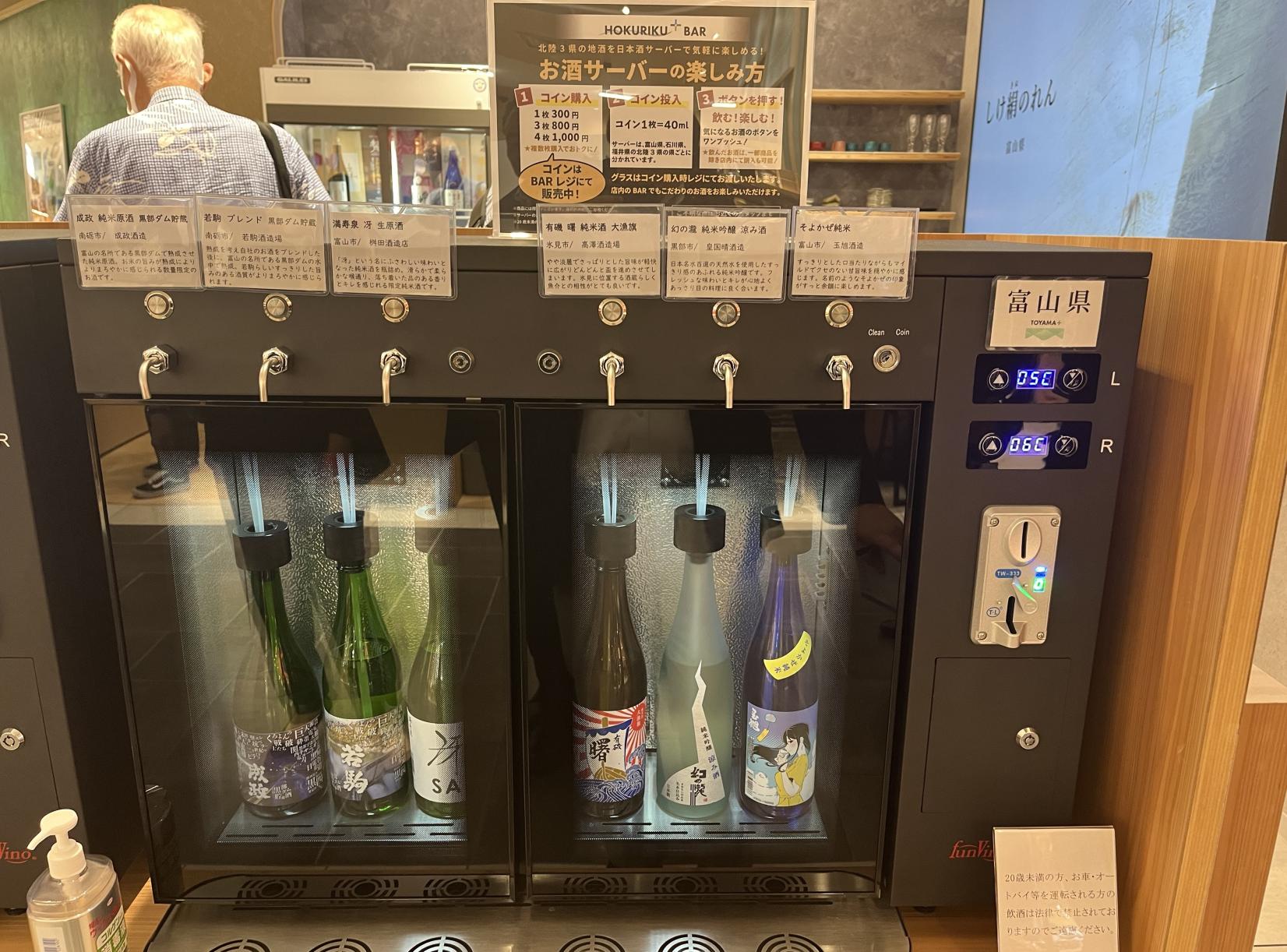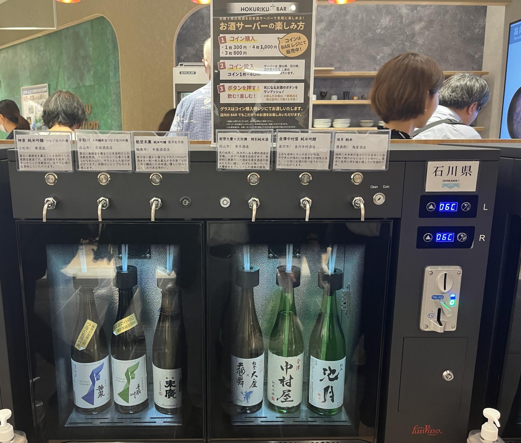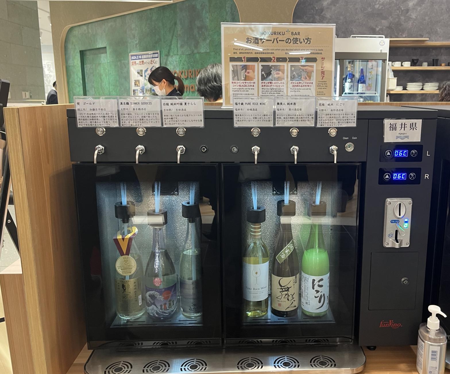 また、バーの手前には日本酒サーバーが設置されており、コイン購入で3県の酒が気軽に試飲できるようになっている。
