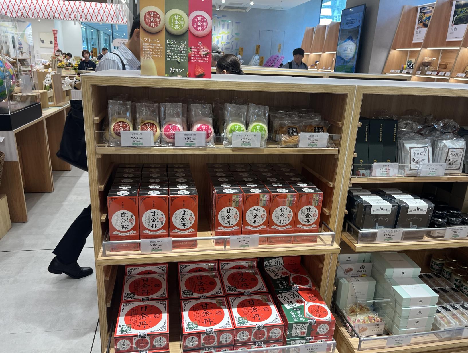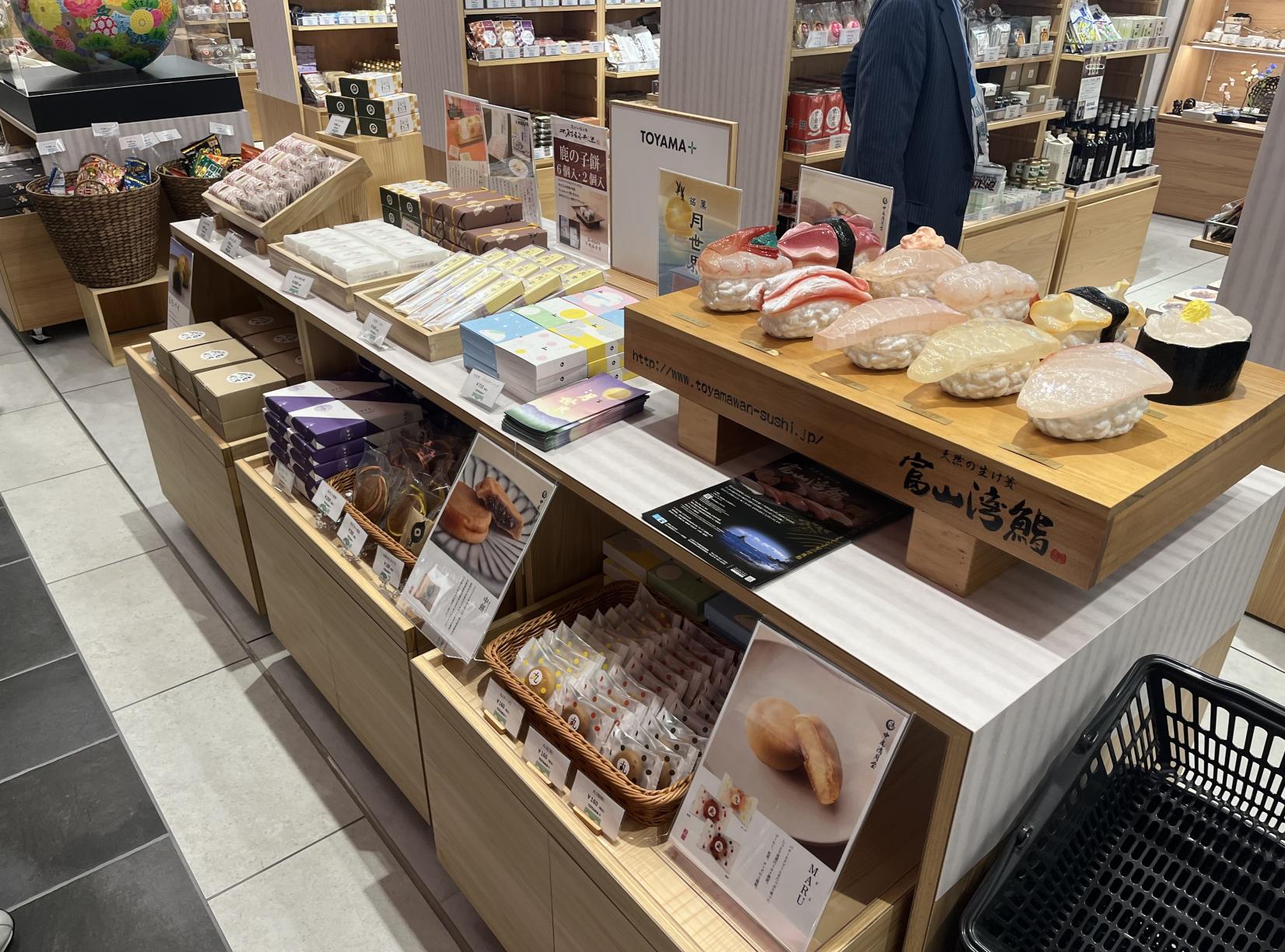 続いては、北陸の名産品と工芸品がずらり並ぶ物販エリア。富山県の販売区域は「富山湾鮨」のオブジェが目印で、定番から通好みまでの約100点の商品を揃えている。銘菓では、しろえびせんべいや、カスタードケーキのような食感が人気の「甘金丹(かんこんたん)」といったおすそわけに最適な商品を取り扱っている。