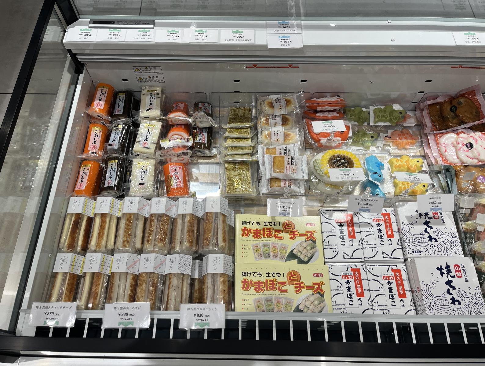 冷蔵および冷凍コーナーでは、赤巻きや昆布巻きなどのかまぼこ、ホタルイカの沖漬け、いかの黒作りなどの海産物も充実している。