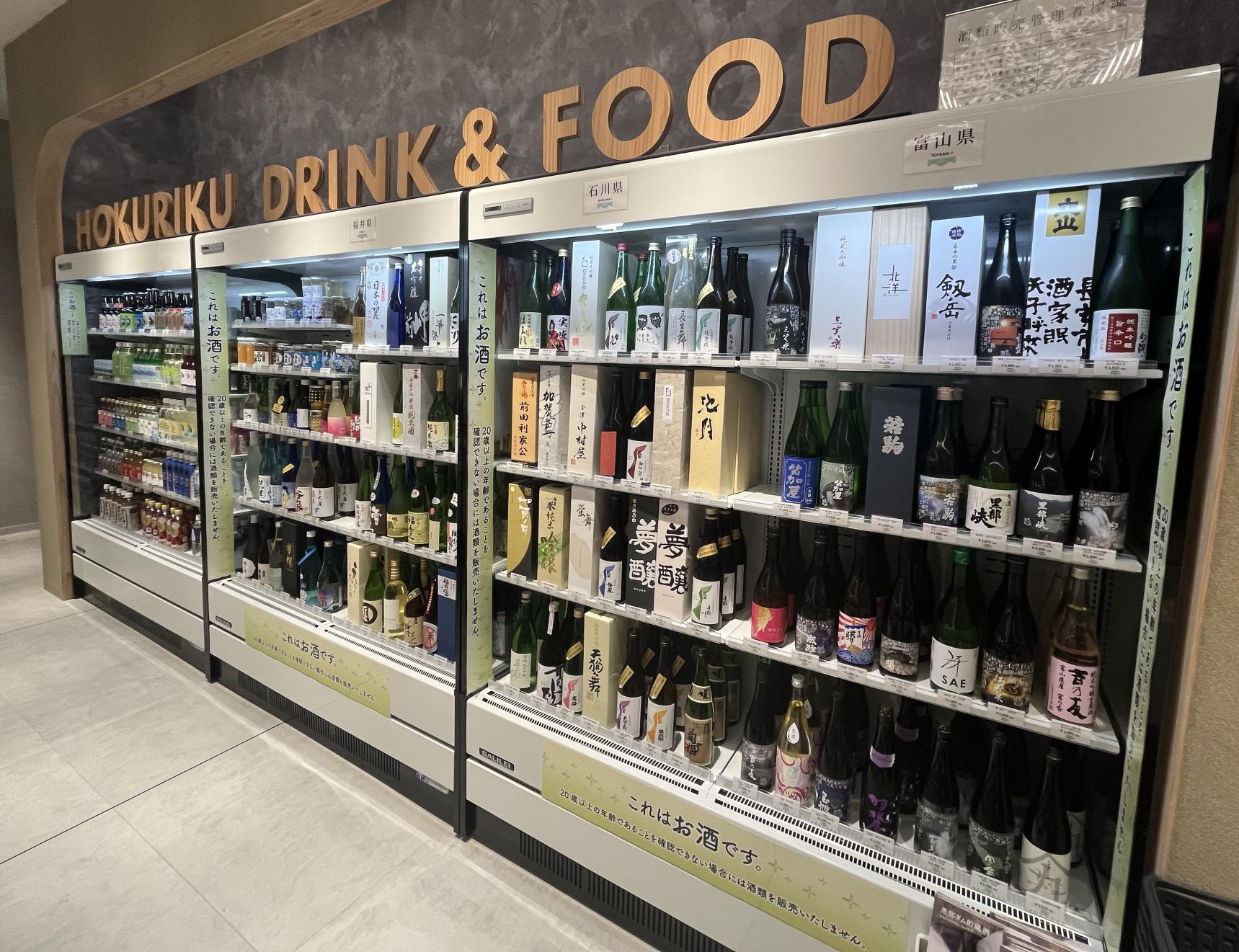 飲料コーナーでは、バーエリアで取り扱う酒や、「富山ブラックサイダー」といったご当地ドリンクもある。