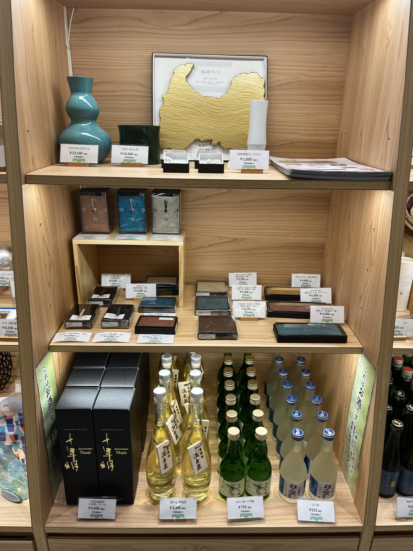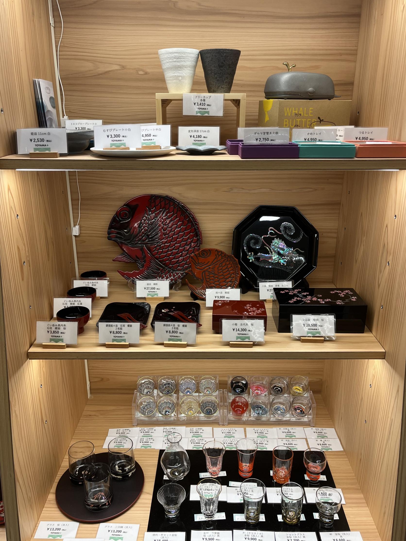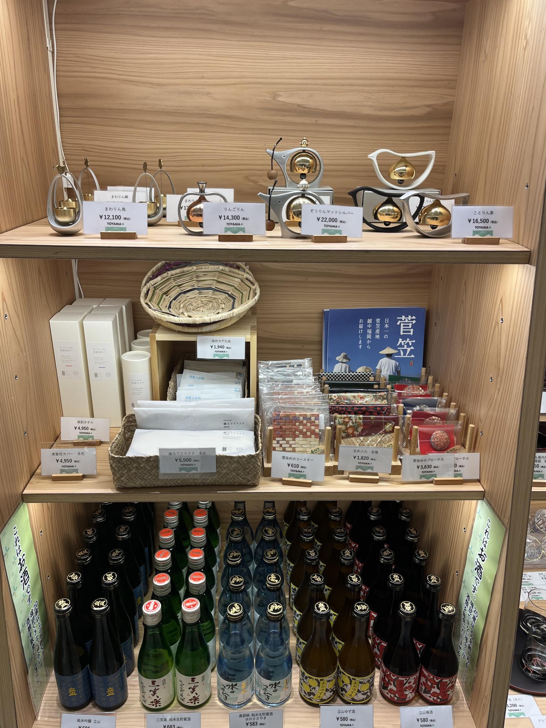 このほか、富山の伝統的工芸品の「高岡漆器」や「高岡銅器」の器、「越中福岡の菅笠」の名刺入れといった商品も置かれている。思わず手に取って見入ってしまう細かな技術で作られた工芸品は、贈答品にもぴったりだ。