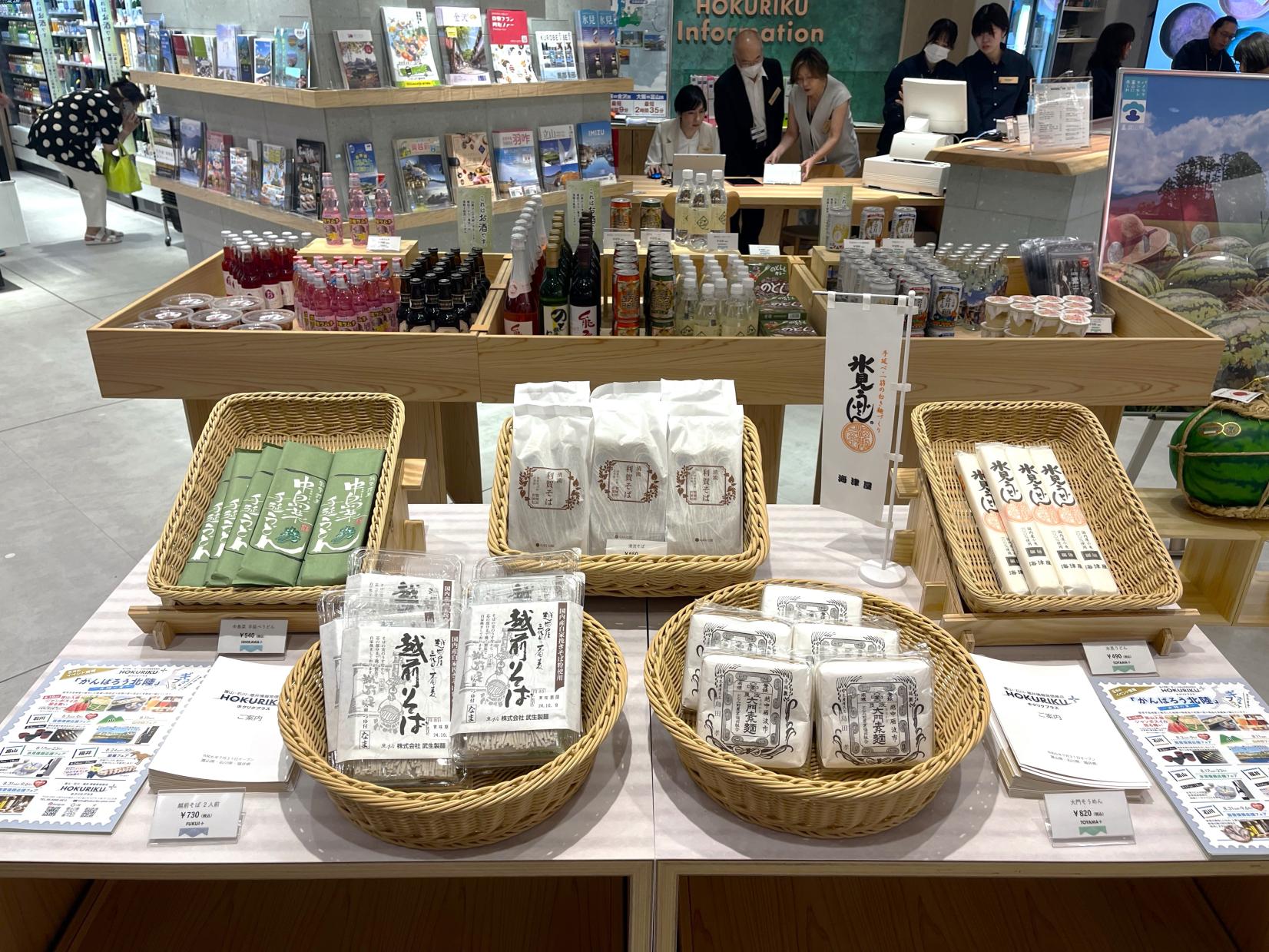 イベントスペースでは、季節やテーマに応じて北陸ならではのフェアを展開する。今回は夏らしく、大門(おおかど)そうめんや越前そば、中島菜うどんといった冷やして食べたい麺類と、地ビールや地サイダーなど爽快感のある飲料が陳列されていた。イベント情報は「HOKURIKU+」のホームページで随時更新されている。